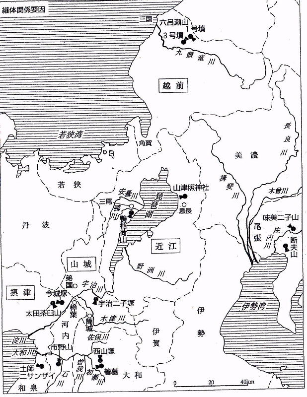 ・継体関係要図・・継体天皇を支持する地方の豪族たち。 それを示す古墳群、越前の六呂瀬山古墳・尾張の断夫山古墳・味美二子山古墳、 東近江の息長氏と山津照神社、高島の鴨稲荷山古墳、宇治二子塚など。 そして継体陵とされる茨木の太田茶臼山古墳と高槻の今城塚古墳等を示す。 |