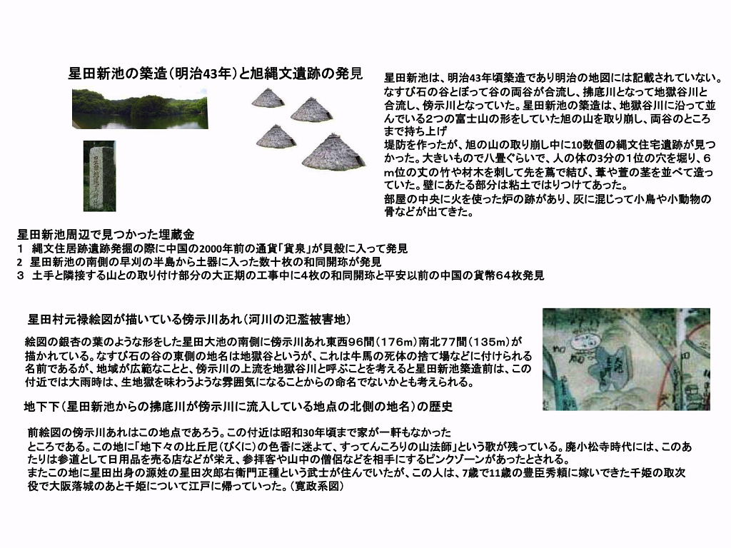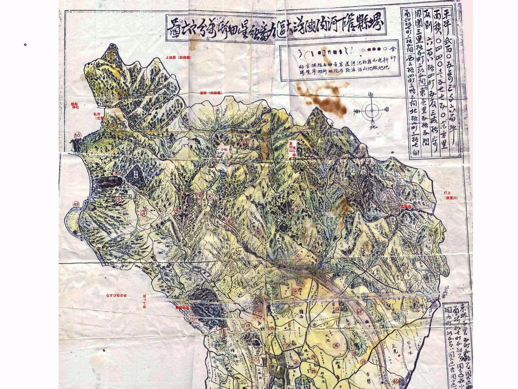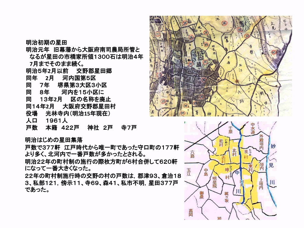 | 明治の初期は、炊事、風呂などの燃料は薪が中心で、食材を含めて自給のウエイトが高く、 また徒歩交通の時代で山越えは最短のルートであり、その分だけ山は、日常生活に欠かせない存在であった。 その分、地図記載のルートや地名などの情報量が多く、また明治43年築造の星田新池がなく、 なすび石の滝のなすび石やクライミングウオールの前身の岩内道などの記載があるなど歴史的価値ある情報も多い。 |