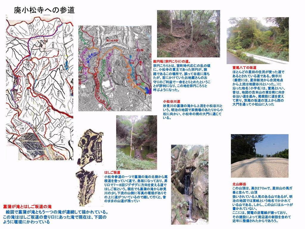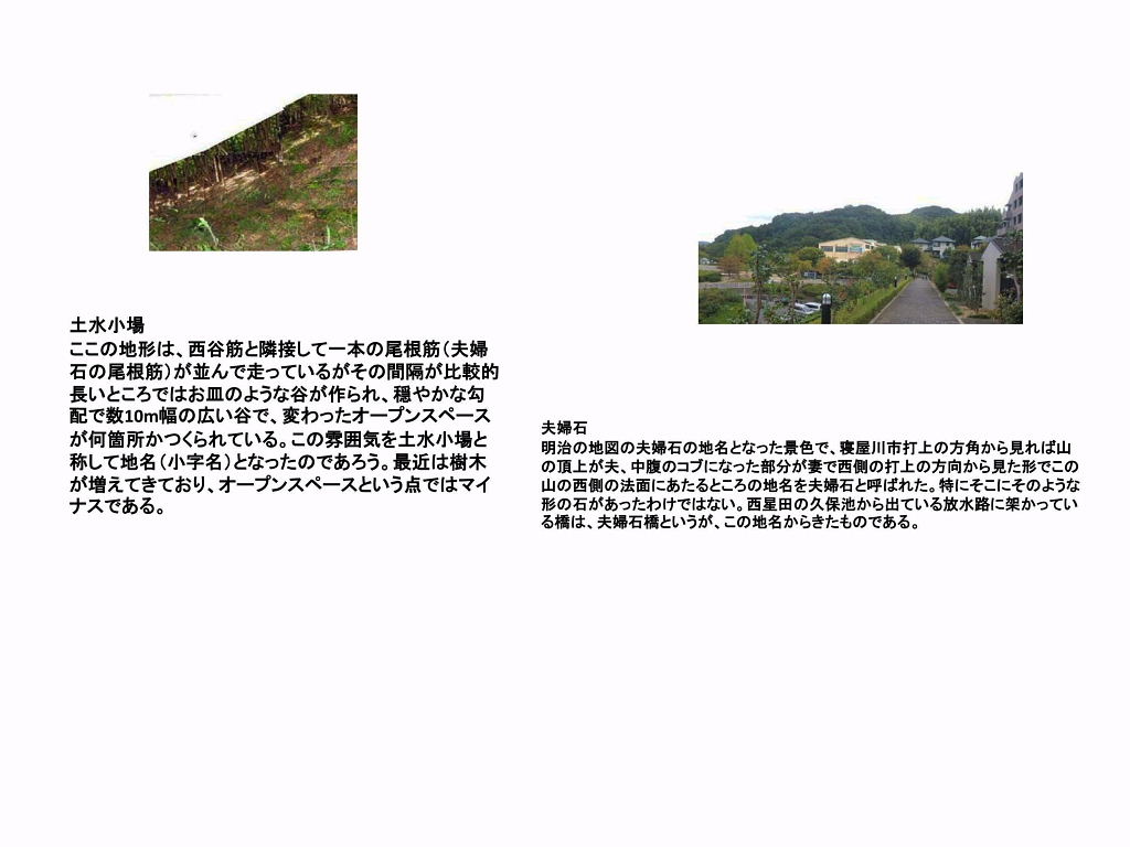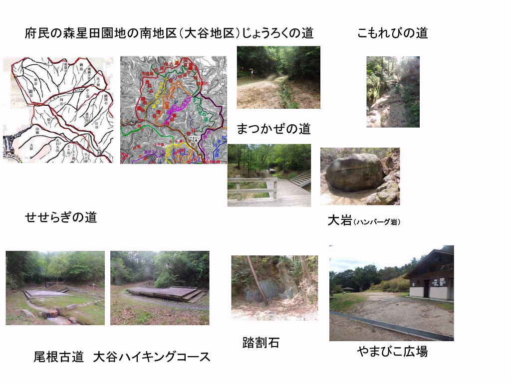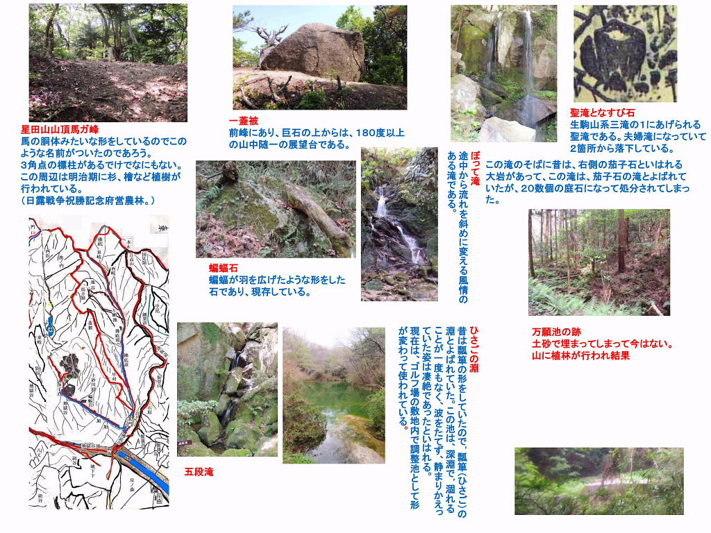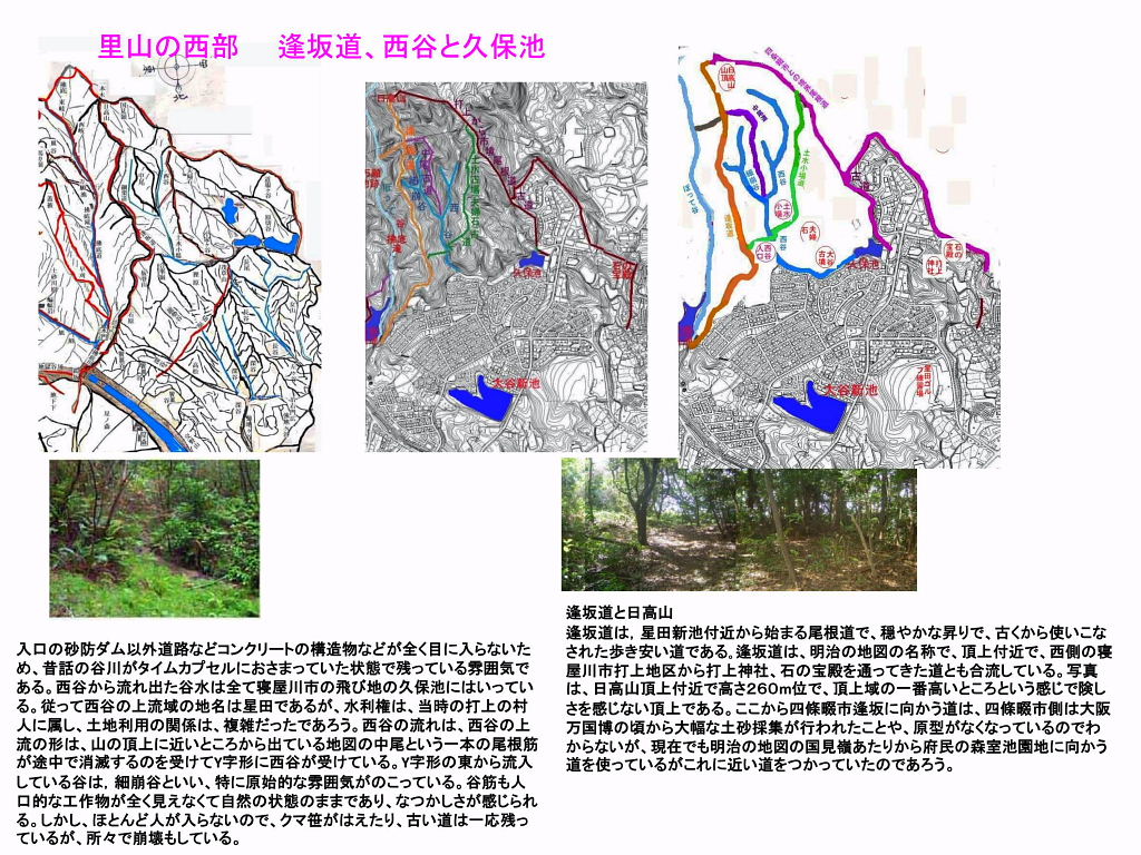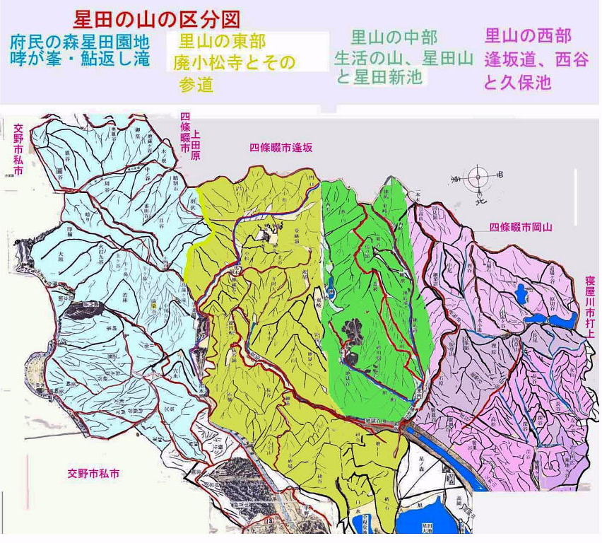 | 星田の山を大きくは府民の森と星田の里山にわけ。 小分類として星田の里山部分はなすび石の谷とぼって谷が三つに分断しており、 里山の中央は、割林、早刈など薪取りや肥料用草刈をした小字名をもつ地域であり、 「生活の山 星田山と星田新池」として、 里山東部は、「廃小松寺を中心にその参道であったルート」が中心であり、 里山西部は、ぼって谷の西の日高山山系は、山全体が寝屋川市(打上)の 飛び地である久保池の流入圏に属し、事情が少し異なり、 30~40年ほとんど人が入らない地域が多く、タイムカプセルを開く魅力もある山である。 |