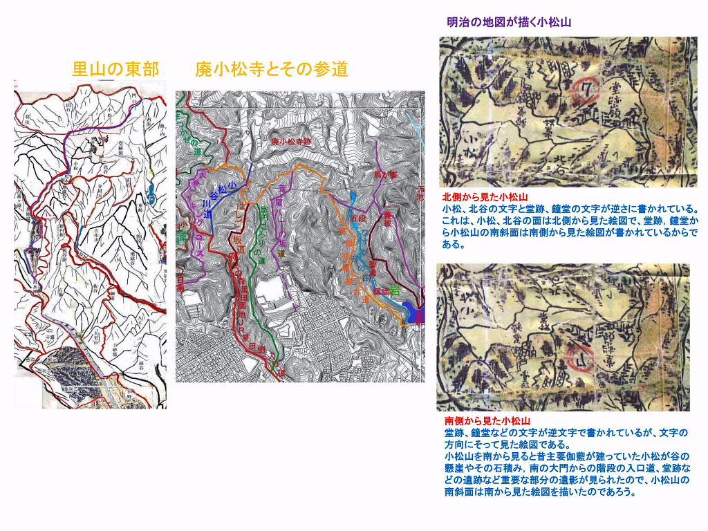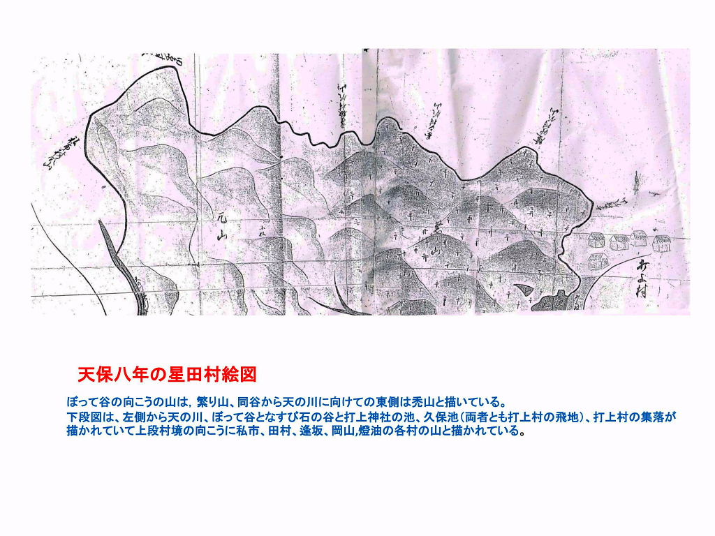 | 正式名称を堺県管下河内国第3大区第9番組萬分之六図といって1萬分の1の実測絵地図である。 この地図の原図の状態では合印(現在の地図の凡例のこと)は、耕地、宅地などのほかに特に山岳部分では山林、藪地、砂山等が記号で記載されている。 これで見ると地図は、星田妙見山と現在の府民の森のピトンの小屋の北西の若林の地名のところは、山林一色で標示されていて、それと比較すると星田の山は、全般的に樹木が少なく、特に星田山や小松などの中央部で禿山が進んでいることがわかる。 星田妙見は、昔から縄文の森といはれ、樹木が多いのは当然であるが、 次に原図からこの山林、藪など環境標示を全て抹消すると、現在3D表示といわれているように全般的には南上位で写真で写したような立体表示となり(普通の地図は山の高さは高低図で客観表示であるがこの場合は山の形で相対的な高さであらわしている。)、これは、村、字の境界が境界尾根である場合は正確に表示されるが、境界が川筋の場合など低地で、影の部分ができる場合は、正確には表現できない。 哮峯周辺や星田妙見など天の川や妙見川など川が境界の場合は、前者は、西上位、後者は、東上位で描くなど工夫がされている。また廃小松寺のあった小松山は北面にあった懸崖の石垣や南の大門口の遺跡などの都合で部分的に北上位に描かれている。 炊事、風呂などの燃料は薪が中心で、食材を含めて自給のウエイトが高く、また徒歩交通の時代で山越えは最短のルートであり、その分だけ山は、日常生活に欠かせない存在であった。その分、地図記載のルートや地名などの情報量が多く、また明治43年築造の星田新池がなく、なすび石の滝のなすび石やクライミングウオールの前身の岩内道などの記載があるなど歴史的価値のある情報も多い。 星田の山を大きくは府民の森と星田の里山にわける。 なすび石の谷とぼって谷が三つに分断しており、里山の中央は、割林、早刈など薪取りや肥料用草刈をした小字名をもつ地域であり、「生活の山 星田山と星田新池」として、里山東部は、「廃小松寺を中心にその参道であったルート」が中心であり、里山西部は、ぼって谷の西の日高山山系は、山全体が寝屋川市(打上)の飛び地である久保池の流入圏に属し、事情が少し異なり、30~40年ほとんど人が入らない地域が多く、タイムカプセルを開く魅力もある山である。 もともと小字の地名で大谷と南谷に分かれており、前者は磐船神社口から天の川に雨水を放出する排水系統域であり、後者はピトンの小屋付近から天の川に放出する排水系統域のことであるが、具体的には磐船神社側の入口からやまびこ広場に通ずる管理道付近を境界として園地を2分している。 以上の区分に従ってルートの概要、地名、名所旧跡などを述べるとともにポケットPGSで歩いたトラックを2500分の1の現在の詳細地図に落とし、対比できるようにした。 |