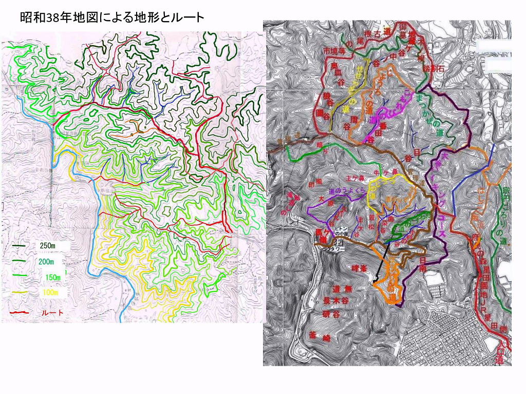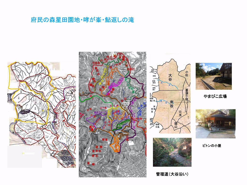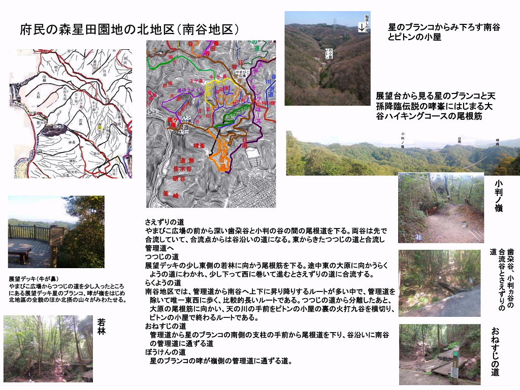 | 府民の森星田園地は、もともと小字の地名で大谷と南谷に分かれており 、前者は磐船神社口から天の川に雨水を放出する排水系統域であり、 後者はピトンの小屋付近から天の川に放出する排水系統域のことであるが、 具体的には磐船神社側の入口からやまびこ広場に通ずる管理道付近を境界として園地を2分している。 以上の区分に従ってルートの概要、地名、名所旧跡などを述べるとともに ポケットPGSで歩いたトラックを2500分の1の現在の詳細地図に落とし、対比できるようにした。 |