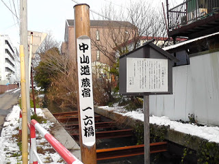 「旧中山道一里塚の跡」と言う比較的新しい石柱を道路の左側に見る。「蕨宿」に入った。錦町6丁目3番地の道路際に「中山道蕨宿一番地」の木製縦型の標識。その足元には20センチぐらいの高さで雪がかき寄せられてある。「境橋」を渡る。渡るといっても長さ2メートル半。渡ったという感覚は全くない。錦町5丁目に来ると「一六橋」がある。一と六のつく日に「市」が開かれたことがこの名の由来だとわかる。長久山宝蔵寺の前を過ぎる。「中山道蕨宿」の石柱で記念撮影。この宿内の両サイドの歩道には、40センチ角で中山道69宿場の、歌川広重と渓斎英泉の陶板絵が埋め込まれてある。錦町1丁目の信号を過ぎると「戸田橋」「巣鴨」の文字が交通標識に現れてきた。もう目的地も近い。実は今日は蕨宿内ではなく少し板橋よりの西川口に宿をとってある。 ………続く。