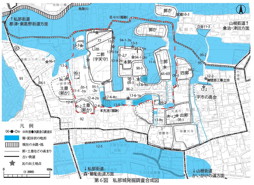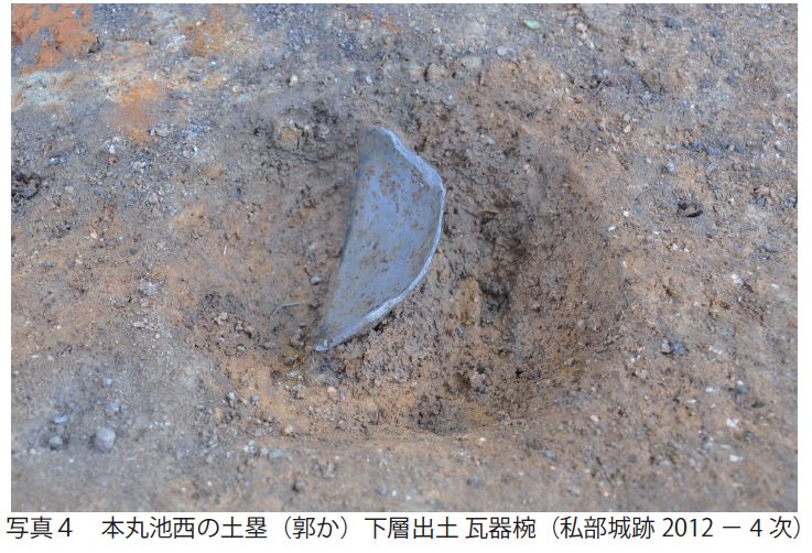 本郭、出郭の廃棄土坑や、堀の埋土中で16 世紀中頃~後半までの瓦が出土し、それより新しい時代の出土品はない。私部城は戦国時代の終わりとともに役目を終え、堀の多くは埋められている。