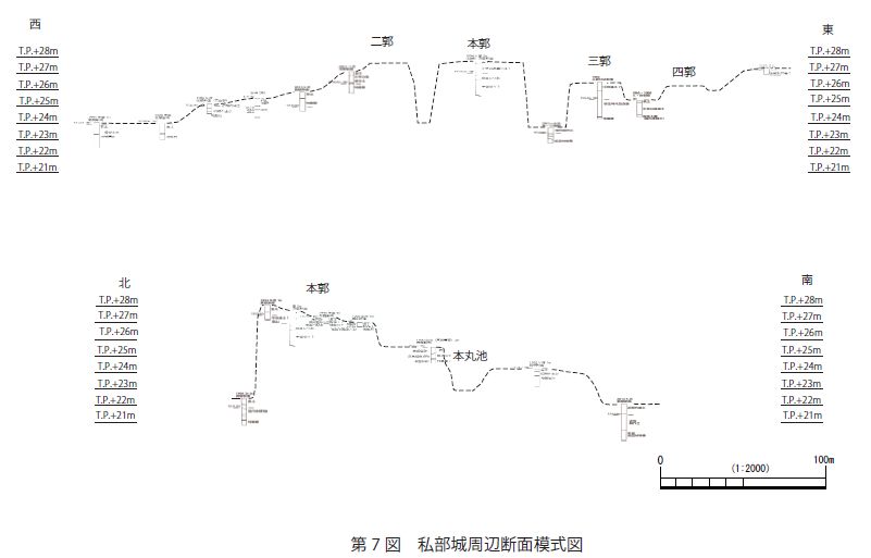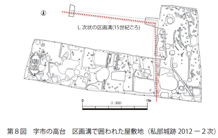 本丸池西の土塁盛土下層の出土品(写真4)から、城ができる前の14 世紀ごろに、私部城の周辺部に集落があったとわかる。15 世紀ごろの私部の中心は、字市の高台上の堀で囲われた屋敷地とみられる(第8図)。堀の方向が一致することから、山根街道に沿った字市の町割りがこの頃にできていたこともわかった。