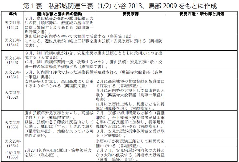 (1)歴史上に登場する私部城(交野城) (第1・2表)