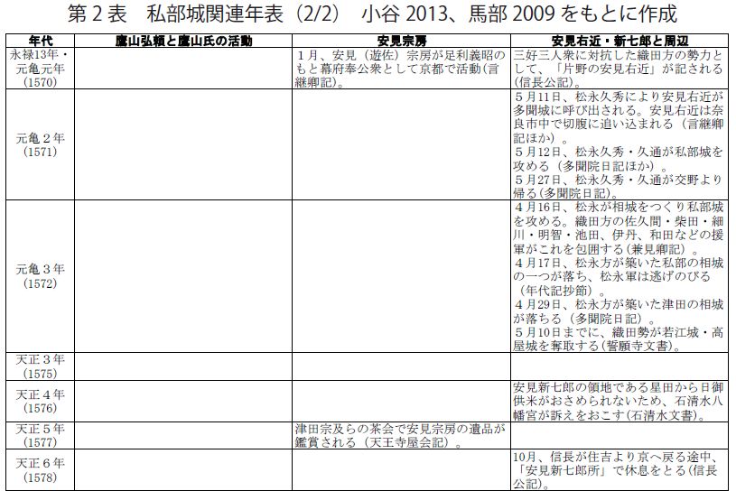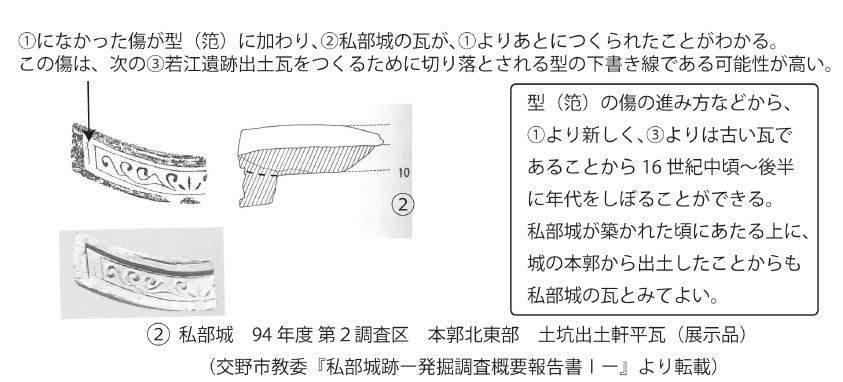 ③織田信長の城からの影響 安見右近が私部城主となった背景として、織田の配下となったことを重視する考えがあり(馬部2009)、その後を守った新七郎も織田政権下で取次をつとめたことがわかっている。織田の城からの影響の可能性がないとはいいきれない。ただし、摂津や河内、奈良といった在来の瓦工人によりつくられている点や、その特徴が織田の城の瓦に先行しているものである点をふまえると、後の織田の城の瓦の源流の一つとみる方が妥当。
