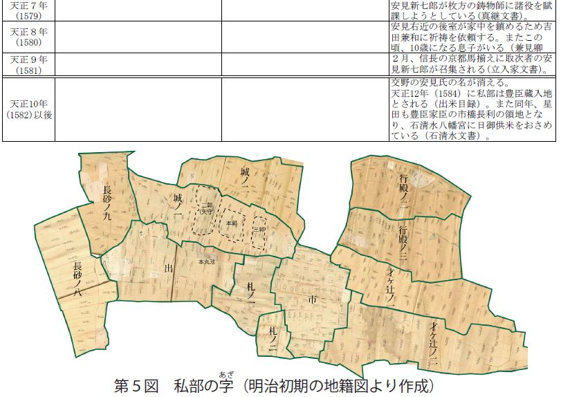 ・文献の調査からは、謎の多かった安見氏や、戦国期前後の私部について手がかりが増えてきた。戦国の梟雄である松永久秀と織田信長の間で揺れ動いた安見右近や新七郎の姿が垣間見えるようになってきた。