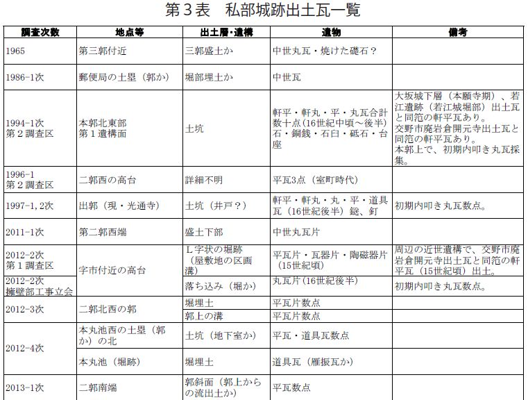 ①畿内地域の先進性 中井均氏が河内長野市烏帽子形城などの事例から、河内をはじめとした畿内の城で先進的に瓦利用がなされていたことを指摘している。私部城で瓦が利用された背景には、畿内の城における瓦利用の先進性が強く影響したとみられる。
