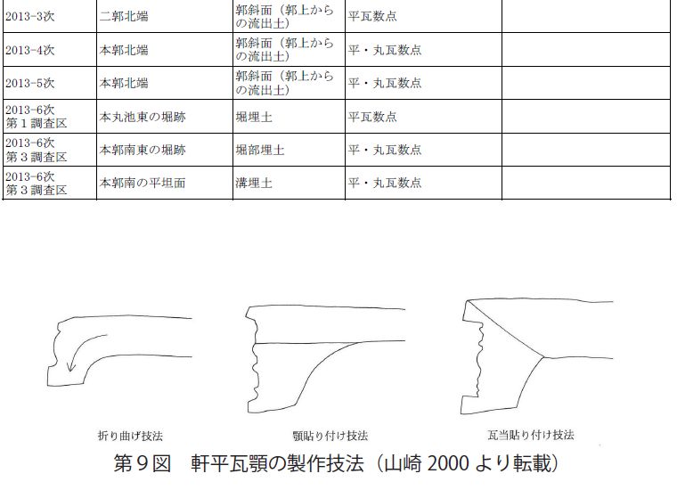 部分的な丸瓦の内叩き技法、軒丸瓦の瓦当裏面に刻みを入れる接合技法は、織田の城郭