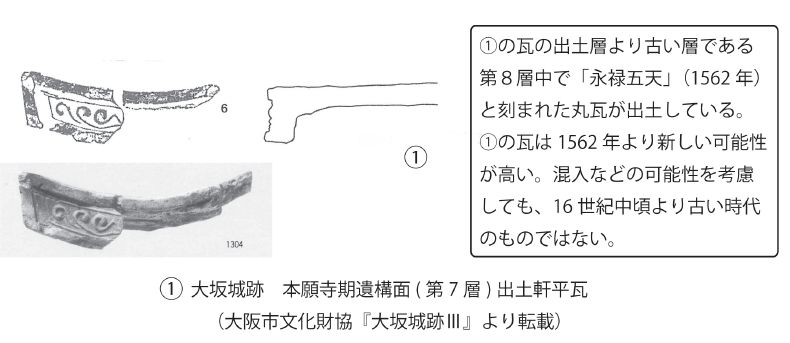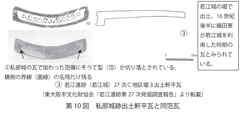 顎貼り付け(第9図)主体で、16 世紀代のものとわかる。(山崎2000)さらに、私部城出土の三葉唐草文瓦(第10 図の②)は、大坂城下層(本願寺期)と、若江遺跡(若江城の堀)で出土した同笵瓦との先後関係から、16 世紀中頃~後半に年代を絞り込める。