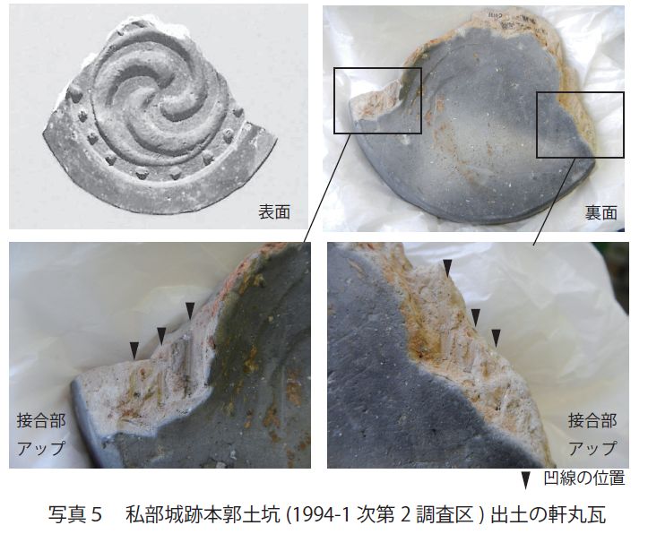 軒丸瓦の瓦当裏面側に刻み(凹線)がある(写真5)。軒丸瓦の瓦当と丸瓦部の接合をしやすくするためのもの。法隆寺の瓦編年によれば室町時代にはない(佐川1989)。交野市域でも15 世紀~16 世紀前半ごろの瓦には認められない。勝龍寺城・多聞城など、戦国期の城で認められる技法であり、私部城の軒丸瓦もこの頃のものとみられる。