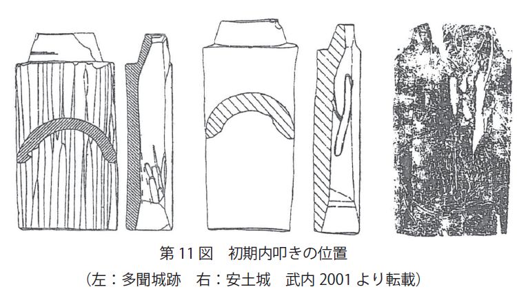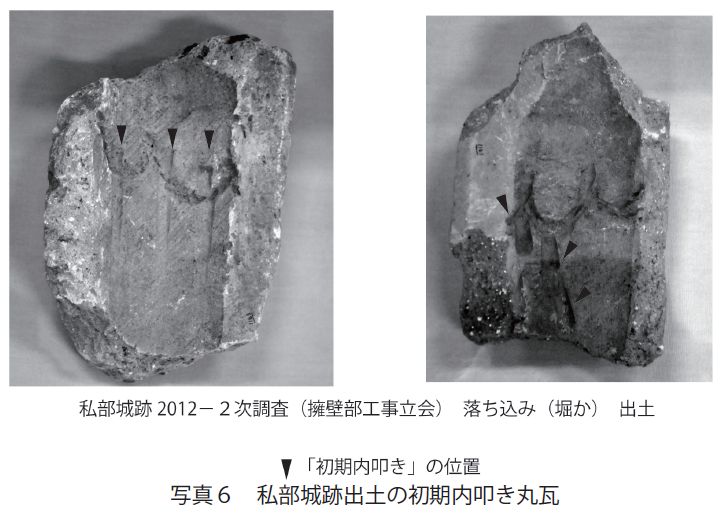 凹面を部分的に道具で叩いた痕跡がある(写真6)。丸瓦凹面全体を叩く江戸時代の内叩きと区別し、「初期内叩き」と呼ばれる(第11 図 武内2001)。16 世紀前半まで奈良の法隆寺などの瓦で認められる。京都の東福寺や平等院などでも一部認められる。これが畿内各地に広がるのが16 世紀後半からであることから、私部城の丸瓦も16 世紀後半に入ってつくられたものとわかる(第4、5表)。