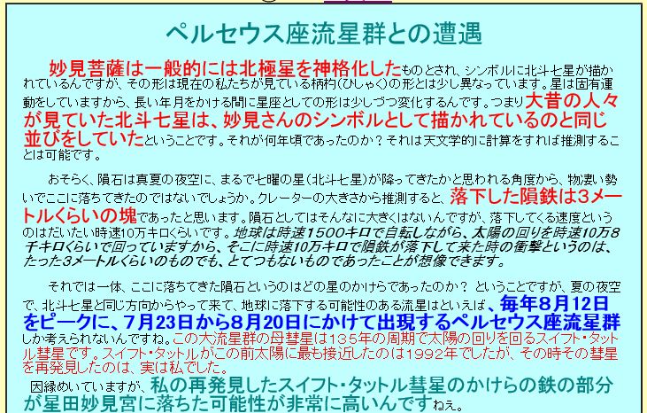 これは隕石が山の大部分を吹き飛ばしたことが原因であると判断し、専門家が計算をしたところ、816年7月23日に、北斗七星の方向から来たペルセウス流星群が隕石の正体ではないか、と推定されました。