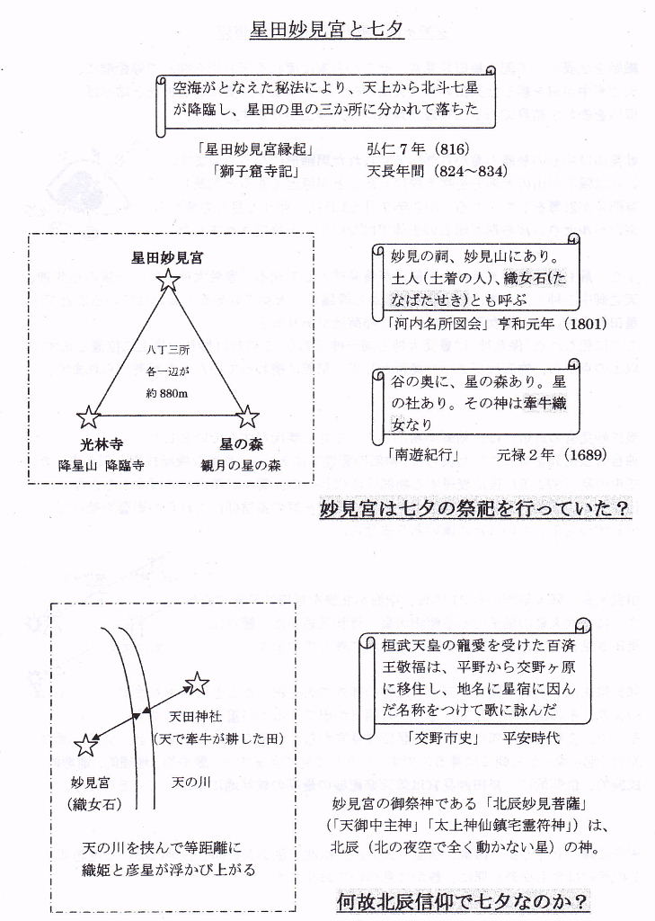 桓武天皇の郊天祭祀から31年後、空海が北辰を星田妙見宮で祀り、さらに桓武天皇の皇子である嵯峨天皇、淳和天皇がたて続けに星田妙見宮へ行幸した記録が、当社縁起に残っています。