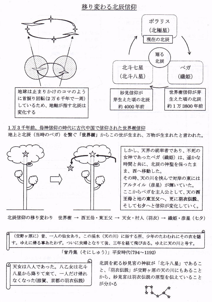 これらの共通点は、北辰の運行によつて導かれます。地球は止まりかけのコマのように首振り回転をしており、地軸が指す北辰の場所は、26,000年周期で巡つています。約13,800年前は織姫星(ベガ)が北辰であり、約4,000年前は北斗七星が北辰でした。