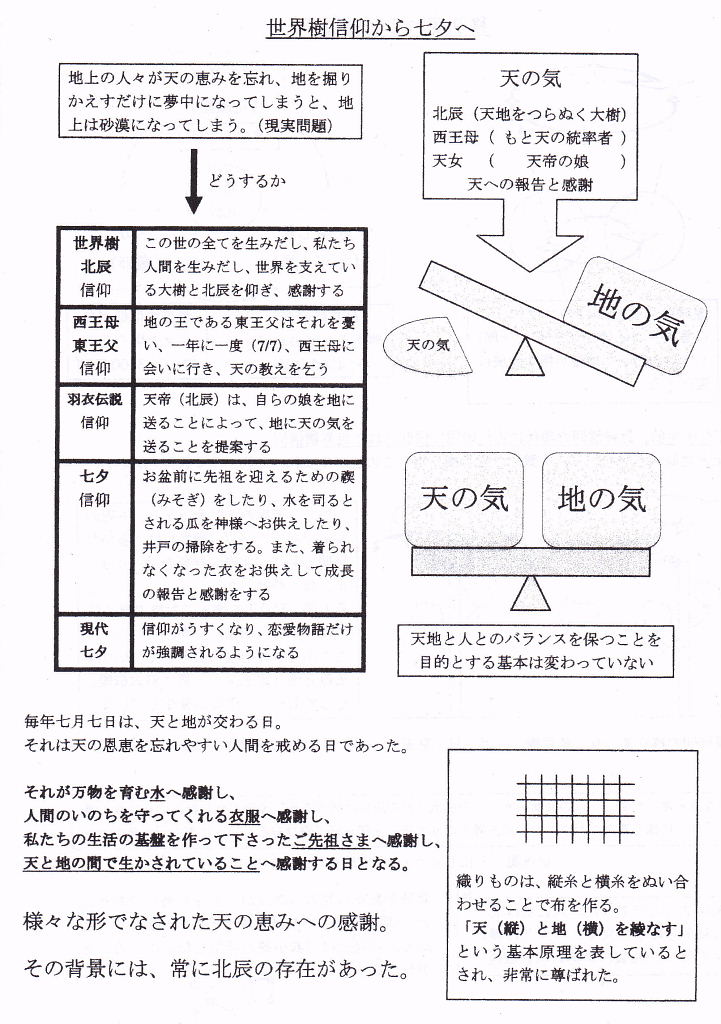 北辰信仰は、天界と地底界とを貫くようにそびえ立つ宇宙樹(世界樹)から万物が生まれ、その頂点である北辰にある星は、この宇宙の秩序を司る神であると言われるもので、北欧のユグドラシルを始め、世界各地に同じ神話、信仰が見られます。