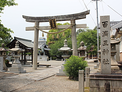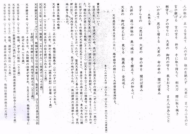 | 百済王家とは、百済滅亡の時、我が国に亡命した百済王の子の禅広(ぜんこう)一族のことである。天智天皇は、禅広のため、摂津の国に百済郡を創設して、一族をそこに住まわせた。禅広のひ孫にあたる敬福(きょうふく)は天平15年(743)に陸奥守(むつのかみ)に任ぜられた。その敬福が天平勝宝元年(749)、黄金900両を献じた。東大寺大仏に鍍金用の金が不足していたときだったので、聖武天皇はいたく喜んで彼に従三位を授け、宮内卿に任じ、河内守を加えた。このとき、枚方の地が与えられ、一族は摂津の百済郡からこの地に移り住んだ。 | |||||||||||||||||||
