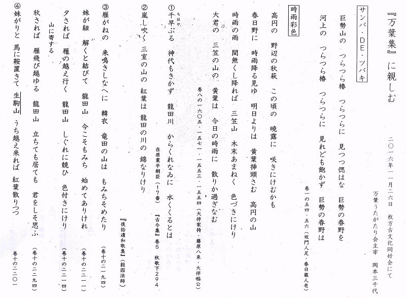 | 「万葉集に親しむ」 レジメ 講師:岡本三千代氏(万葉うたがかり会主宰) |