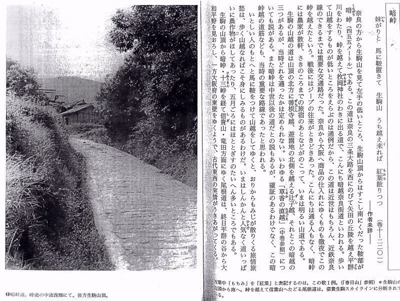 奈良の方から生駒山を見て左手の低いところ、生駒山頂からはすこし南にくだった鞍部が暗峠(くらがりとうげ)(455m)である。この道は奈良の三条大路を西に延びて矢田の丘陵を越え平群川をわたり、峠を越えて枚岡神社のわきに出る道で、こんにち暗越奈良街道と言われる。歩いて山越をするものが低いところをえらぶのは通例だから、この道は近世はもちろん、近鉄奈良線のできるまでは重要な交通路だった。奈良から大阪へ商品の仕入れにゆくものも徹夜でこの峠を越えたという。戦後にはジープの往来がときどきあった。こんにちは通る人もなく、暗峠には農家が数軒、さきのころまでの旅宿のあとなどがのこって、いまは明るい山道である。 生駒の山越えの道は山頂の北方に善根寺越え、遊園地の北側を越える辻子越え、それとこの暗峠の三つがあるが、当時どれを通ったかは定められない。いわゆる「草香の直越」についても説がある。また暗峠は中世以後の道だとの説もあるが、確証のあるわけでなく、この暗峠越の道筋なども、当時の重要な路線であったと思われる。 いとしい人のもとへと馬に鞍をつけて山越をしてゆくと、おりからもみじが散りくる旅情旅愁は、歩く山越なればこそ身にしみるものがあるわけだ。いまはしんかんと人気なく道いっぱいに農作物がほしてあったり、5月ごろにはほととぎすの大変おおいところでもある。 生駒の山頂から暗峠・十三峠を経て信貴山・竜田方面にゆく尾根道は、終日平群の谷から大和平野を見下ろし、一方大阪府の東壁をゆくようで、古代東西の実情がうきあがってくる。 |