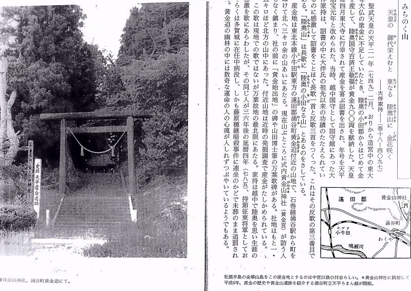 | 産金地は東北本線小牛田駅東方の遠田郡涌谷町黄金迫付近の山地で、石巻線涌谷駅から町をぬけて北へ3キロ余の山あいにあたる。現在山ぶところに式内黄金山神社(黄金宮)が訪う人もなく鎮まり、社の前に「黄金始出地」の碑や山田博士筆の万葉歌碑がある。社地はもと1.5キロほど北方の山中にあった。付近山地は近時の発掘調査で産金がたしかめられている。 この歌は現地での歌ではないが万葉故地の最北限にあたる。家持は越中で陸奥を思い生涯の感激を歌にあらわしたが、その同じ人が三六年後の延暦四年(七八五)、持節征東将軍としておそらくは多賀城に在任中病没し、しかも藤原種継暗殺事件に連坐のかどで未葬のまま追罰された。黄金迫の幽林の中には数奇な運命の人の心魂が人しれずつぶやいているようでもある。 黄金山神社に隣接して平成六年、産金の歴史や黄金山遺跡を紹介する涌谷町立天平ろまん館が開館された。 詳細は、涌谷町立天平ろまん館ホームページを参照ください。 |