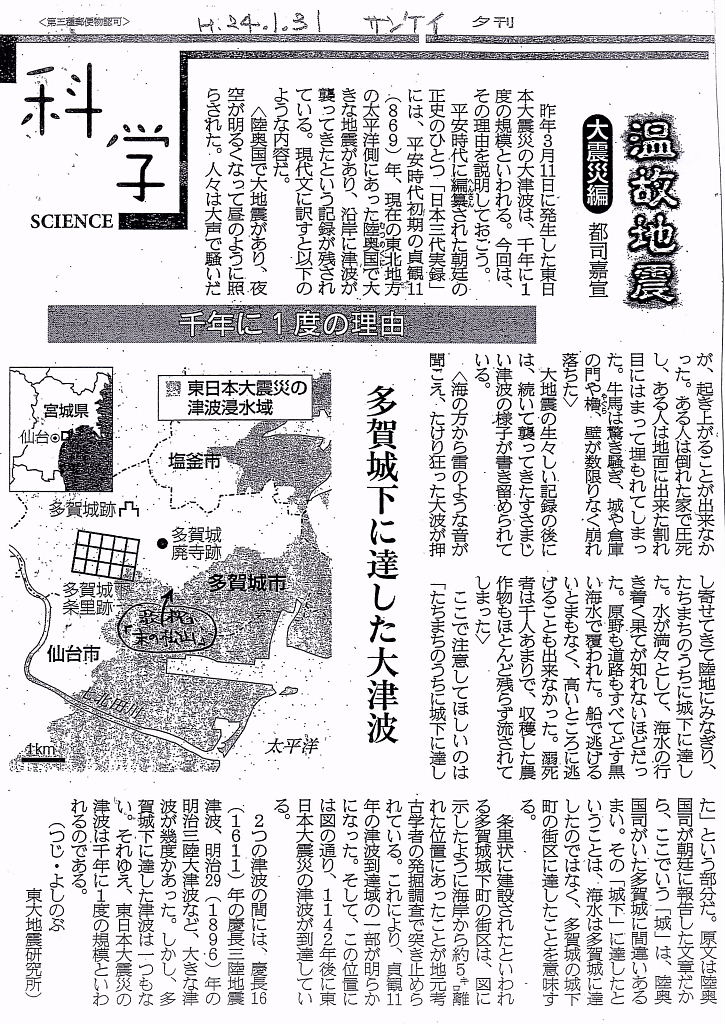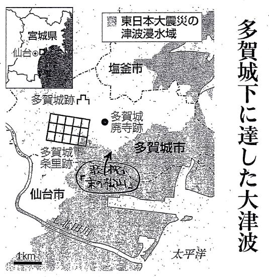 | <産経新聞 平成24年1月31日 夕刊記事より> 多賀城下に達した大津波 千年に一度の理由 昨年3月11日に発生した東日本大震災の大津波は、千年に1度の規模といわれる。今回は、その理由を説明しておこう。 平安時代に編纂された正史のひとつ「日本三代実録」には、平安時代初期の貞観11(869)年、現在の東方地方の太平洋側にあった陸奥国で大きな地震があり、沿岸に津波が襲ってきたという記録が残されている。現代文に訳すと以下のような内容だ。 <陸奥国で大地震があり、夜空が明るくなって昼のように照らされた。人々は大声で騒いだが、起き上がることが出来なかった。ある人は倒れた家で圧死し、ある人は地面に出来た割れ目にはまって埋もれてしまった。牛馬は驚き騒ぎ、城や倉庫の門や櫓、壁が数限りなく崩れ落ちた> 大地震の生々しい記録の後には、続いて襲ってきたすさまじい津波の様子が書き留められている。 <海の方から雷のような音が聞こえ、たけり狂った大波が押し寄せてきて陸地にみなぎり、たちまちのうちに城下に達した。水が満々として、海水の行き着く果てが知れないほどだった。原野も道路もすべてどす黒い海水で覆われた。船で逃げるいとまもなく、高いところに逃げることも出来なかった。溺死者は千人あまりで、収穫した農作物もほとんど残らず流されてしまった> ここで注意してほしいのは「たちまちのうちに城下に達した」という部分だ。原文は陸奥国司が朝廷に報告した文章だから、ここでいう「城」は、陸奥国司がいた多賀城に間違いあるまい。その「城下」に達したということは、海水は多賀城に達したのではなく、多賀城の城下町の街区に達したことを意味する。 ・ 条里状に建設されたといわれる多賀城城下町の街区は、図に示したように海岸から約5キロ離れた位置にあったことが地元考古学者の発掘調査で突き止められている。これにより、貞観11年の津波到達域の一部が明らかになった。そして、この位置には図の通り、1142年後に東日本大震災の津波が到達している。 2つの津波の間には、慶長16(1611)年の慶長三陸地震津波、明治29(1896)年の明治三陸大津波など、大きな津波が幾度かあった。しかし、多賀城下に達した津波は一つもない。 それゆえ、東日本大震災の津波は千年に1度の規模といわれるのである。 (都司嘉宣(つじ・よしのぶ) 東大地震研究所) |