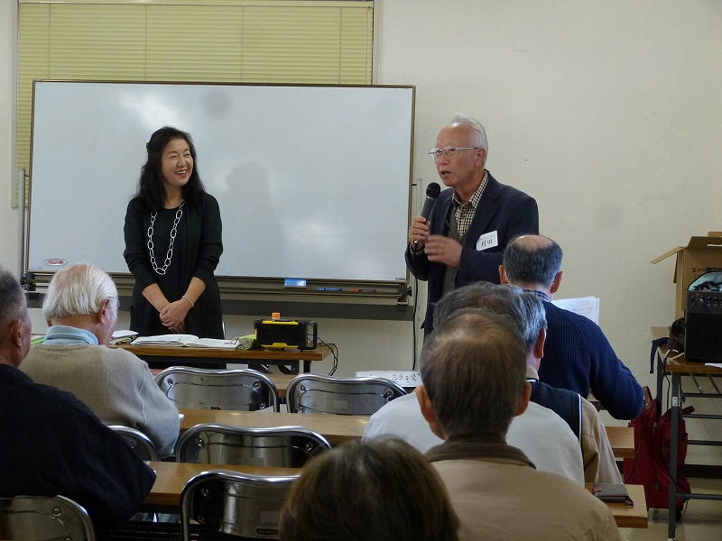 ![]() 村田事務局長の挨拶に笑顔で応えられる岡本先生 |