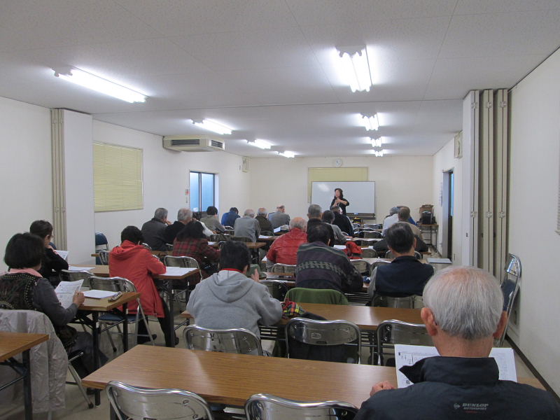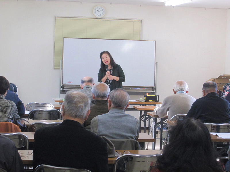 ![]() 講演は、「もみじ」の歌を全員で斉唱して始まった! 紅葉(もみじ) うた:NHK東京児童合唱団 作詞:高野辰之 秋の夕日に 照る山紅葉 濃いも薄いも 数ある中に 松をいろどる 楓や蔦は 山のふもとの 裾模様 渓の流に 散り浮く紅葉 波にゆられて 離れて寄って 赤や黄色の 色さまざまに 水の上にも織る錦 |