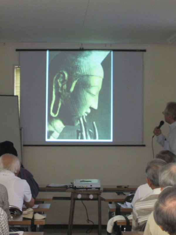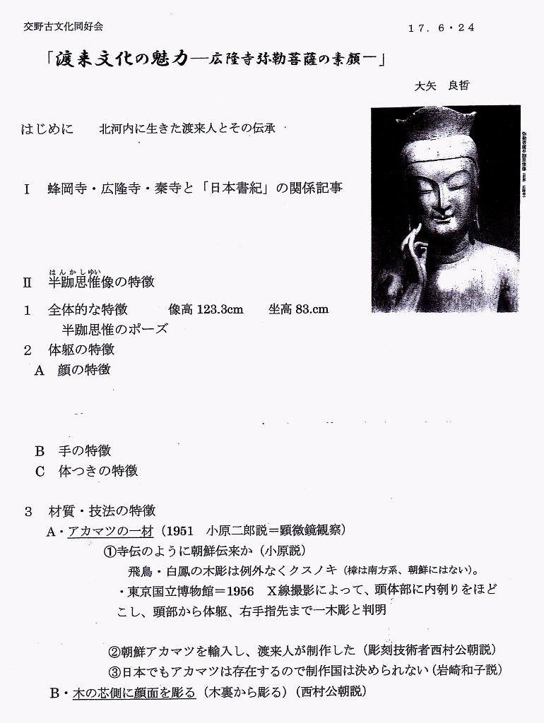 | 2017.6.24(土)午前10時、6月定例勉強会に33名が参加されました。 高尾部長の司会で始まり、立花会長の挨拶の後、講師の大矢良哲氏から「渡来文化の魅力」をテーマで、「弥勒菩薩の歴史的な背景・経緯や魅力について」ご講演をいただいた後、広隆寺の弥勒菩薩などの映像などを交えながら「弥勒菩薩の素顔」に迫って頂きました。 今回講師にお招きいたしました「大矢 良哲先生」は、交野市私部のご出身で、交野古文化同好会の立花会長と同級生だそうです。 先生のご講演を機に広隆寺を訪れ、じっくりと「弥勒菩薩」を観察・拝観したいと思いました。参加された方からも私と同じ気持ちになられた方が多いようです。 (講演の概要) <渡来文化の魅力> はじめに Ⅰ.蜂岡寺・広隆寺・秦寺と「日本書紀」の関係 Ⅱ.半跏思惟像の特徴 1 全体的な特徴 2 体躯の特徴 3 材質・技法の特徴 Ⅲ.半跏思惟像の名称 Ⅳ.宝冠弥勒菩薩像の二つの顔ー修理前と修理後 1 明治37年~38年 修理前の写真 2 同修理前の石膏型の頭部 3 上記石膏からの鋳造 4 昭和52年 NHK番組 明治の型取りから弥勒像の顔の復元 Ⅴ.韓国・金銅菩薩半跏像との比較 おわりに ※ HPの掲載に当たり、講師のご厚意で当日頂戴しましたレジメ及び映像などを 参考にさせて頂きましたこと、記して感謝申し上げます。 また、WEBのウィキペディア、広隆寺関連のHPなどを参照させていただきました。 |