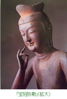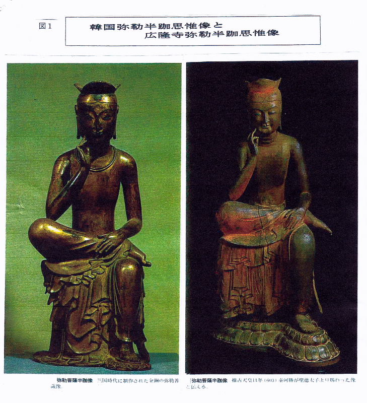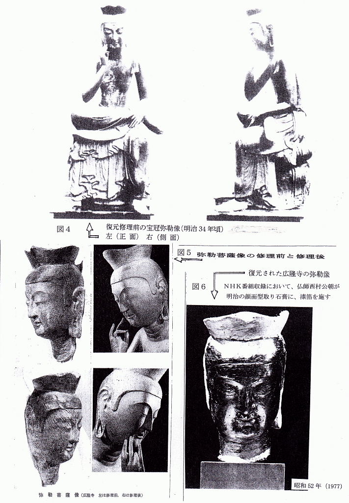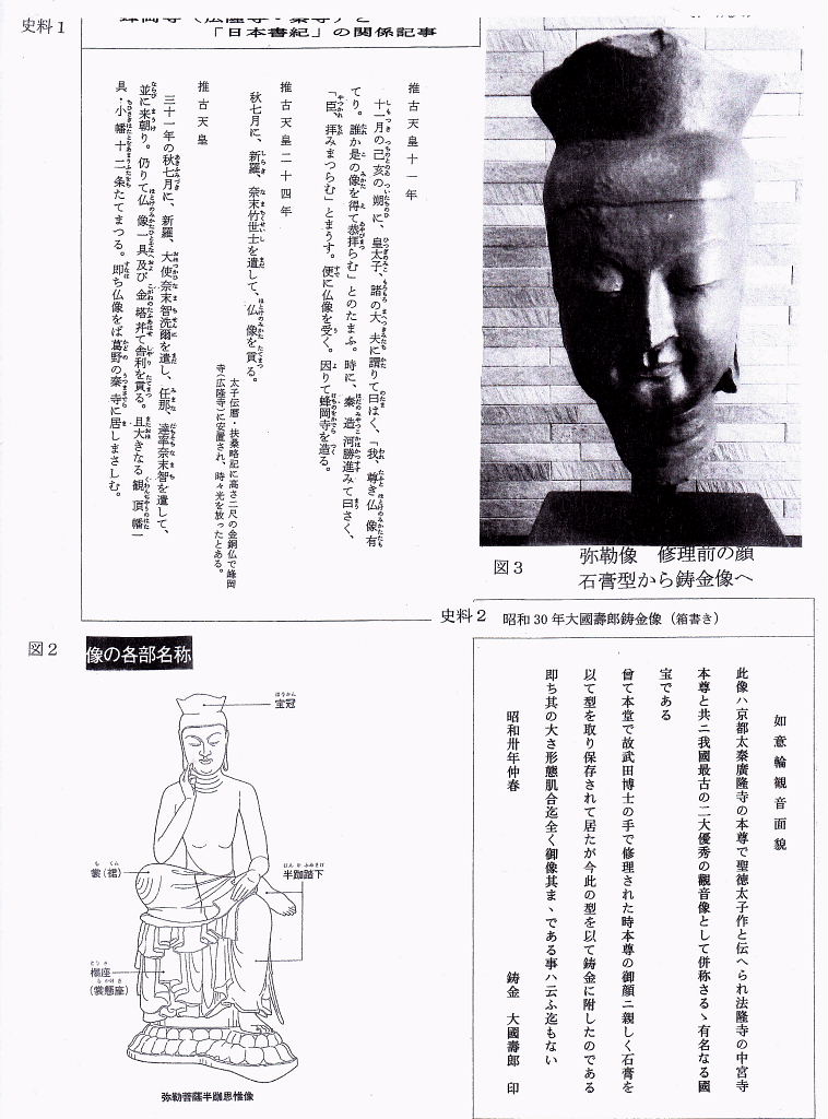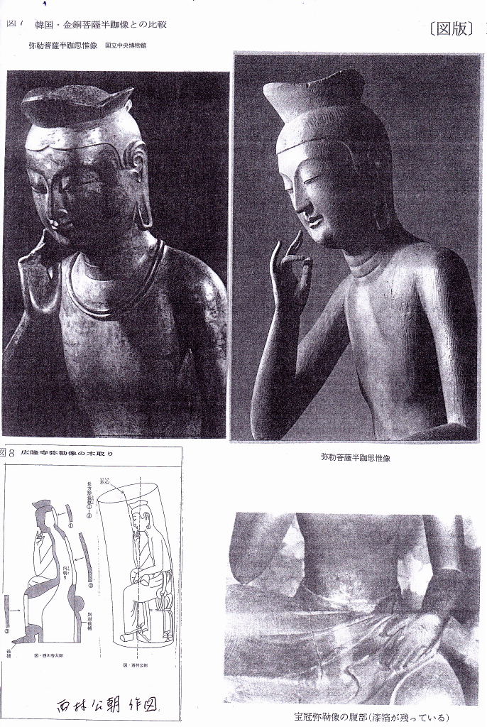 C.体つきの特徴 ほっそりとした体つきで、その柔らかい肉体・体のこなし・衣の自然な皺は中宮寺像よりも進んでいる。半跏倚座(=椅子に座って右足を曲げ、左足の上に載せたもの。)である。 この姿勢は、奈良時代以前の弥勒菩薩に多いポーズで、日本の一般の弥勒菩薩には、宝冠をかぶり、蓮華座(=蓮の花弁。)を象る上に結跏趺座している。 ③.材質・技法の特徴 A・アカマツの一材(1951 小原二郎説=顕微鏡観察) ①寺伝のように朝鮮伝来か(小原説) 飛鳥・白鳳の木彫は711外なくクスノキ(樟は南方系、朝鮮にはない)。 ・東京国立博物館=1956 X線撮影によつて、頭体部に内割りをほど こし、頭部から体躯、右手指先まで一本彫と判明 ②朝鮮アカマツを輸入し、渡来人が制作した(彫刻技術者西村公朝説) ③ 日本でもアカマツは存在するので制作国は決められない(岩崎和子説) 第二次世界大戦後まもない1948年、小原二郎は、本像内部の内刳り(軽量化と干割れ防止のため、木彫像の内部を空洞にすること)部分から試料を採取し、顕微鏡写真を撮影して分析した結果、本像の用材はアカマツであると結論した。日本の飛鳥時代の木彫仏、伎楽面などの木造彫刻はほとんど例外なく日本特産のクスノキ材であるのに対し、広隆寺像は日本では他に例のないアカマツ材製である点も、本像を朝鮮半島からの渡来像であるとする説の根拠となってきた。ところが、1968年に毎日新聞刊の『魅惑の仏像』4「弥勒菩薩」の撮影のさい、内刳りの背板はアカマツ材でなく、クスノキに似た広葉樹が使用されていることが判明した。この背板は後補ではなく、造像当初のものとみられる。この点に加え、アカマツが日本でも自生することから本像は日本で制作されたとする説がある。 B・木の芯側に顔面を彫る(木裏から彫る)(西村公朝説) Ⅲ 半枷思惟像の名称 ・寛平2年(890)の「広隆寺資財校替実録帳」 「金色弥勒菩薩像壱躯 同高二尺八寸 所謂太子本願形」 ・野中寺の金銅弥動半枷像の銘文にも「丙寅年(666)」「弥勒御像也」とある。 広隆寺には「宝冠弥勒」「宝髻(ほうけい)弥勒」と通称する2体の弥勒菩薩半跏像があり、ともに国宝に指定されている。宝冠弥勒像は日本の古代の仏像としては他に例のないアカマツ材で、作風には朝鮮半島の新羅風が強いものである。一方の宝髻弥勒像は飛鳥時代の木彫像で一般に使われるクスノキ材である。 『広隆寺来由記』(明応8年・1499年成立)には推古天皇24年(616年)、坐高二尺の金銅救世観音像が新羅からもたらされ、当寺に納められたという記録がある。また、『書紀』には、推古天皇31年(623年、岩崎本では推古天皇30年とする)、新羅と任那の使いが来日し、請来した仏像を葛野秦寺(かどののはたでら)に安置したという記事があり、これらの仏像が上記2体の木造弥勒菩薩半跏像のいずれかに該当するとする説がある。 像高は123.3センチメートル(左足含む)、坐高は84.2センチメートル。アカマツ材の一木造で、右手を頬に軽く当て、思索のポーズを示す弥勒像である。像表面は、現状ではほとんど素地を現すが、元来は金箔でおおわれていたことが、下腹部等にわずかに残る痕跡から明らかである。右手の人差し指と小指、両足先などは後補で、面部にも補修の手が入っている。 制作時期は7世紀とされるが、制作地については作風等から朝鮮半島からの渡来像であるとする説、日本で制作されたとする説、朝鮮半島から渡来した霊木を日本で彫刻したとする説があり、決着を見ていない。この像については、韓国ソウルの韓国国立中央博物館にある金銅弥勒菩薩半跏像との様式の類似が指摘される ※弥勤とは 古代インド・サンスクリット(梵語)のマイトレヤの音訳 菩薩とは菩提(=悟り。)薩埵(=衆生。)(=悟りを求める衆生。)の略であり、サンスクリット語のボーディサット(bodhisattva)を漢訳したものである。如来の補佐役であり、図像的には装飾品や宝冠を身に付け、三尊形式(=中尊〔=如来。〕+脇侍〔=菩薩。〕)で表されることが多い。 大乗仏教では発菩提心(=悟りを求める心を起こすこと。)を得た者は全て菩薩と見なされるが、修行進度・教義理解に応じた、経典によるランキングがあり、最上位の菩薩は次の転生で輪廻転生から解放され、如来になることができるとされている。 また如来とは最高位の仏であり、図像的には大日如来を除いて、原則的に装飾品は無い。 Ⅳ 宝冠弥勒菩薩像の二つの顔一修理前と修理後 1.明治37年(1904)~ 38年)修理前の写真… いかにも朝鮮系 a.明治21年(1888) 小川一真撮影写真(東京国立博物館情報アーカイブ) b.年次不詳 久野健旧蔵写真 早稲田大学の会津記念室には、明治37年修理以前の石膏型の頭部が残されているが、頬により肉がついている。当初は漆箔(=漆の上から金箔を押した物。)の像であり、全身金箔で覆われ、金色に輝いていたようだが、現在は剥落してしまっている。後世の修復において、奈良時代の塑像の仕上げに使われたような、繊維の入った土が塗られたが、江戸時代に
