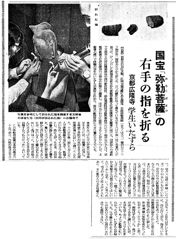 | 「渡来文化の魅カ ー広隆寺弥勒菩薩の孝顔ー」の一考察 I 蜂岡寺・広隆寺・秦寺と「日本書紀」 <広隆寺> 推古天皇11年(603)秦河勝建立の秦氏の氏寺で、聖徳太子の追善の為に創建された。田村圓澄氏によると、推古30年・壬午年(622)創建の所伝もある。地元では太秦のお太子さんとして親しまれる山城最古の寺院であり、法隆寺や四天王寺といった聖徳太子建立の日本七大寺の1つとしても知られる。 寺院名称は、古くは蜂岡寺(はちおか)、秦寺、秦公寺、太秦寺、葛野寺(かどの)と変遷してきた。また創建者の秦一族は、日本書紀によると、応神天皇16年に日本へ渡来し、養蚕・機織・農耕・醸酒を日本へ伝えたとされる。秦氏の本拠地太秦は上代山城文化の中心地でもある。 『日本書紀』によれば、推古天皇11年(603年)聖徳太子が「私のところに尊い仏像があるが、誰かこれを拝みたてまつる者はいるか」と諸臣に問うたところ、秦河勝が、この仏像を譲り受け、「蜂岡寺」を建てたという。 元糺池に建つ珍しい三柱鳥居 木島神社(このしまじんじゃ) 境内に「蚕の社」と通称される養蚕(こがい)神社があることで知られる 正式には木島坐天照御魂(このしまにまずあまてるみたま)神社 一方、承和5年(838年)成立の『広隆寺縁起』(承和縁起)や寛平2年(890年)頃成立の『広隆寺資財交替実録帳』冒頭の縁起には、広隆寺は推古天皇30年(622年)、同年に死去した聖徳太子の供養のために建立されたとある。『書紀』と『広隆寺縁起』とでは創建年に関して20年近い開きがある。これについては、寺は603年に草創され、622年に至って完成したとする解釈と、603年に建てられた「蜂岡寺」と622年に建てられた別の寺院が後に合併したとする解釈とがある。 蜂岡寺の創建当初の所在地について、『承和縁起』には当初「九条河原里と荒見社里」にあったものが「五条荒蒔里」に移ったとある。確証はないが、7世紀前半の遺物を出土する京都市北区北野上白梅町(かみはくばいちょう)の北野廃寺跡が広隆寺(蜂岡寺)の旧地であり、平安京遷都と同時期に現在地の太秦へ移転(ないし2寺が合併)したとする説が有力である。 Ⅱ半跏思惟像(はんかしゆいぞう)の特徴 1.全体的な特徴 像高123.3cm 坐高83.cm 半跏思惟のポーズ 2.体躯の特徴 A 顔の特徴 B 手の特徴 C 体つきの特徴 1..全体的な特徴 彫刻の中で、国宝指定第1号である。像高は123.3cmで、坐高は83.3cm。流れるような木目を特色とし、止利派とは異なる作風を有する。この像は後補の多い蓮華座に腰掛けている。西村公朝氏は修復中、下腹部に漆木屎(うるしこくそ)(=漆に抹香や五穀の繊維を混ぜた物が残る。)を発見し、本来は乾漆の肉盛りが全身を包んでいたことを突き止めた。また岩崎和子氏は、乾漆の程度が、しまって硬さのある肉付きだが、生硬さの残る造形の上半身には、特に厚く、両足のボリュームから、下半身は表面を整える程度(=現状。)であったと推定している。 A .顔の特徴 瞑想的な顔つきをしており、拝む者を心から癒してくれる表情である。なお、如来と菩薩は原則的に優しい慈悲の表情に作られる。(ただし、同じ慈悲の相でも如来像は優しさの中にも厳格さを湛えている形で製作される。)さて、この像は細い目、はっきりとした眉、通った鼻筋をしており、唇の両端にはやや力が込められている。これをアルカイックスマイル(=気品漂う古拙の微笑。飛鳥仏像の特色。)と呼ぶが、西村公朝氏によると、いいアイディアが浮かんだ瞬間の表情であるという。喉は一般的に三道が多く、特に飛鳥時代には横に2本の線を入れておく程度であるのに、本像は四道もある。 B.手の特徴 両手の表現は変化があり、その繊細な指先は優雅である。左手は甲が扁平で、不自然であることから、漆が塗られていたと推定されている。思惟手である右手も一木で造られた物だ。右手の材木は縦の木目で、薬指を除いて、指は木目に沿った形になっており、細い指であっても、折れにくい構造をしている。右手の小指と人さし指は江戸時代に修理した物だが、薬指は昭和35年に京大生に折られるまで現存していた。 1960年(昭和35年)8月18日、京都大学の20歳の学生が弥勒菩薩像に触れ、像の右手薬指が折れるという事件が起こった。この事件の動機についてよく言われるのが「弥勒菩薩像が余りに美しかったので、つい触ってしまった」というものだが、当の学生は直後の取材に対し「実物を見た時"これが本物なのか"と感じた。期待外れだった。金箔が貼ってあると聞いていたが、貼られておらず、木目が出ており、埃もたまっていた。監視人がいなかったので、いたずら心で触れてしまったが、あの時の心理は今でも説明できない」旨述べている。 ![]() 広隆寺指折り事件を報ずる朝日新聞記事~1960.8.20朝刊
