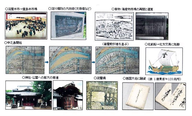 | 淀屋の行動と功績 ●品質・価格安定のための米市場設立と運営(淀屋米市→堂島米市場) ●中之島の開拓(物流の構築) ●淀川堤防の大改修(文禄堤など) ●青物・海産物市場の再開と運営 ●行政への参画と地域への貢献 ●北前船→北方交易の先鞭 ●糸割符の導入 ●神社仏闇への膨大の寄進 ●文化人としての支援と貢献 ●淀屋橋の架橋 ●銀座設立に参画 ●西国大名に融資(最終的に幕府が闕所へ追い込む原因?となつた) |