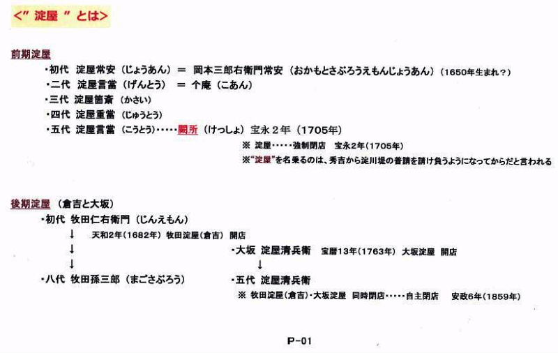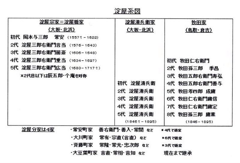 | 前期淀屋 ・初代 淀屋常安(じょうあん)=日本三郎右衛門常安(おかもとさぶろうえもんじょうあん)(1650年生まれ?) ・二代 淀屋言當(げんとう)=个庵(こあん) ・三代 淀屋箇斎(かさい) ・四代 淀屋重當(じゅうとう) ・五代 淀屋言當(こうとう)・闕所(けつしょ)宝永2年(1705年) ※ 淀屋……強制閉店 宝永2年(1705年) ※“淀屋"を名乗るのは、秀吉から淀川堤の普請を請け負うようになってからだと言われる 後期淀屋(倉吉と大坂) ・初代 牧田仁右衛門(じんえもん) ↓ 天和2年(1682年)牧田淀屋(倉吉)開店 ↓ ・大坂淀屋清兵衛 宝暦13年(1763年)大坂淀屋開店 ↓ ↓ ・八代 牧田孫三郎(まごさぶろう) ・五代淀屋清兵衛 ※ 牧田淀屋(倉吉)・大坂淀屋同時閉店…"… 自主開店 安政6年(1859年) |