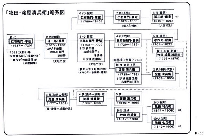 | <前期 淀屋> 初代 淀量常安(じょうあん)=岡本三郎右衛門常安→ 京都山城国の豪族 武士の息子として生まれる 二代 淀屋言當(げんとう)=く个庵(こあん)》 「淀屋」を名乗るのは、秀吉から淀川堤の普請を請け負うようになってからだと言われている。 三代 淀屋箇斎(かさい) 四代 淀屋重當(じゅうとう)・・・天和2年(1682年)番頭牧田仁右衛門に暖簾分け 五代 淀屋廣當(こうとう)・・・宝永2年(1705年)闕所(けつしょ)処分→「淀屋」消滅!(強制閉店) <後期 淀屋> 初代 牧田仁右衛門(じんえもん)<倉吉>牧田淀屋開店 三代 牧田五郎右衛門(ごろうえもん)の四男が大坂淀屋橋で“淀屋"(大坂淀屋)開店 淀屋清兵衛を名乗る ↓ 五代淀屋清兵衛<大坂> “淀屋(大坂)" ↓ 安政6年(1859年) 八代 牧田孫三郎(まごさぶろう)<倉吉> “牧田(倉吉)淀屋" ↑ く同時・自主閉店> |