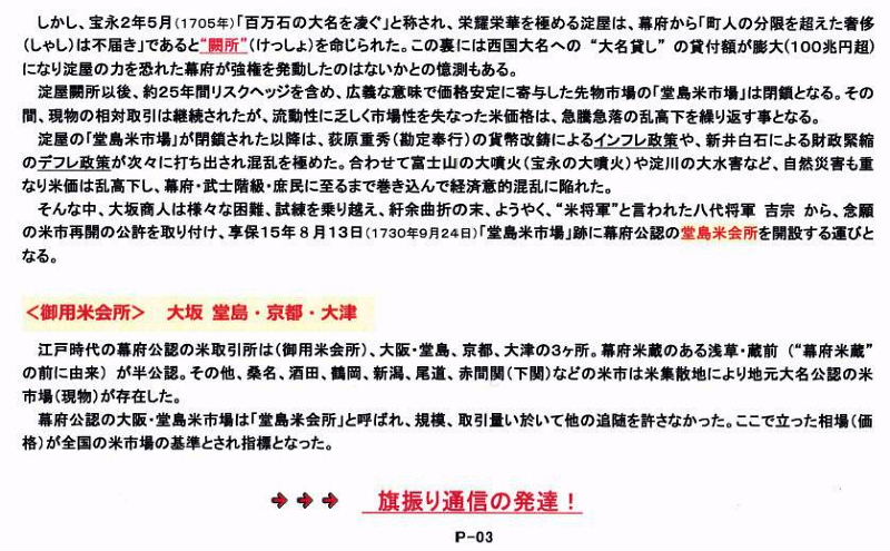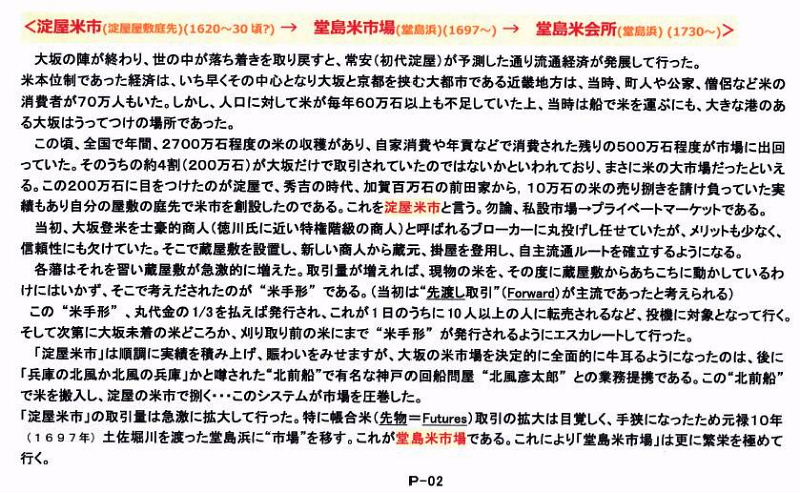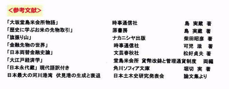 | <参考文献> 「大坂堂島米会所物話」 時事通信社 島実蔵著 「歴史に学ぶお米の先物取引」 原書房 島実蔵著 「旗振り山」 ナカニシヤ出版 柴田昭彦著 「金融先物の世界」 時事通信社 可児滋 著 「日本両替金融史論」 文芸春秋社 松好貞夫著 「大江戸経済学」 堂島米会所貨幣改鋳と管理通貨制度 両編 「日本永代蔵」現代語訳付き 角川ソフィア文庫 堀切 実著 日本最大の河川港湾伏見港の生成と衰退 日本土木史研究発表会 論文集より |