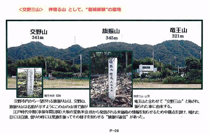 | <交野三山> 神宿る山として、葛城修験の聖地 交野市内から一望される旗振山は、交野山、竜王山とあわせて交野三山と称され、旗振山は名前が示すよう:この山の山頂て旗が振られた事に由来する。 江戸時代中期(享保年間以降)大坂の堂島米会所から発信される米価格の情翻を知らせるため中継点を設け、晴れた日には白旗、曇りの時には黒旗を振ってその様子を知らせる“旗振り通信"があった。 |