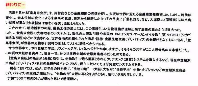 | 終わりに 活況を見せる「堂島米会所」は、両替商などの金融機関の発達を促し、大坂は世界に冠たる金融商業部市でした。しかし、時代は変化し、米本位制の変化による米会所の衰退、幕末から維新にかけて「銀目廃止」「藩札処分」など、大坂商人(両替商)には手痛い状況が重なり大坂経済は賑わいを失う原因ともなった。 合わせて、明治維新の際、薩長土佐の武士には、この素晴らしい先物理論が理解出来ず歴史の舞台から消え去った。しかし、堂島米会所の先物取引のシステムは、現代の大阪取引所や米国のCME(シカゴ・マーカンタイル取引所)やCBOT(シカゴ商品取引所)などに代表される、世界各地の組織化された商品・証券・金融先物取引(デリバティブ)の先駆けをなすものであり、「堂島米会所Jが世界の先物取引発祥の地として大いに誇るべきもである。 今や世界中で、やれ金融工学だ、リスクヘッジだ、レパレッジだとか申しますが、そもそもの元祖がここ大坂堂島の米市場だつた。この頃の大坂は名実共に、世界一で、かつ世界最先端の金融商業都市だつたのである。 『堂島米会所』の帳合米(先物)取引は、先物取引で最も重要とされるクリアリング(清算)システムを導入するなど、現在の金融派生商品(デリバティブ)取引の先鞭を成すものであり、現在に於いてもほぼ完壁なシステムである。 現在においては、だが、百年余の時を経て、“先物の地"→大阪(大坂)に“日経平均"先物・オプションなどの金融派生商品(デリバティブ)の取引が開始され、“先物の街"大阪に再び灯りがともり、賑わいを取り戻している。まさに300年前のDNAが蘇つた思いで感慨深い。 |