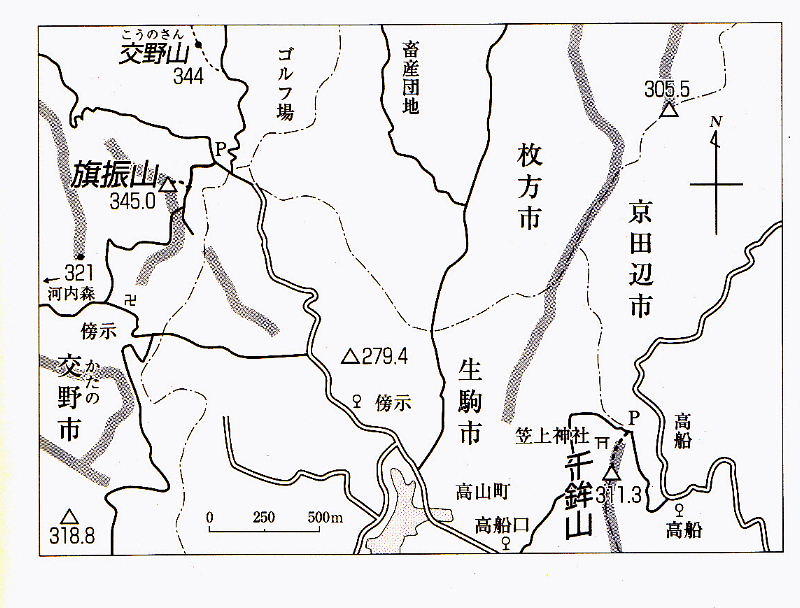 | コースガイド 自動車を利用して、高船の千鉾山、交野市の旗振山を巡ってみたので紹介する。 高船の笠上神社の麓に自動車を駐車させて、神社の石段を上る。広場に出ると、東側の展望が大きく開ける。すぐに不動明王の像があり、その横から忠実に尾根伝いの踏み跡をたどる(あまりよい道ではないので、やぶ慣れた人にしかおすすめできない)。ほどなく、千鉾山の山頂に着く。四等三角点(点名は高船)の石標と「歓喜天拝所」と刻んだ石碑があるが、周囲は竹林で視界は全くない。昔はここでも展望が開けていたのであろう。南方への踏み跡があるが不明瞭なので、元の道を引き返した。 交野の旗振山へは、交野いきものふれあいの里の南端の駐車場(旗振山の北東麓。午後四時半に閉鎖される)に自動車を置く。すぐ南の野外活動センターヘの入り口(午後四時半に閉まるゲートがある)から上がり、道が下りになると、すぐ右手の道標が旗振山まで往復10分と案内している。鉄塔のすぐ上が三等三角点(点名は蓮花石)で、横の一番高くなった所に旗振山と記した標柱がある。 |