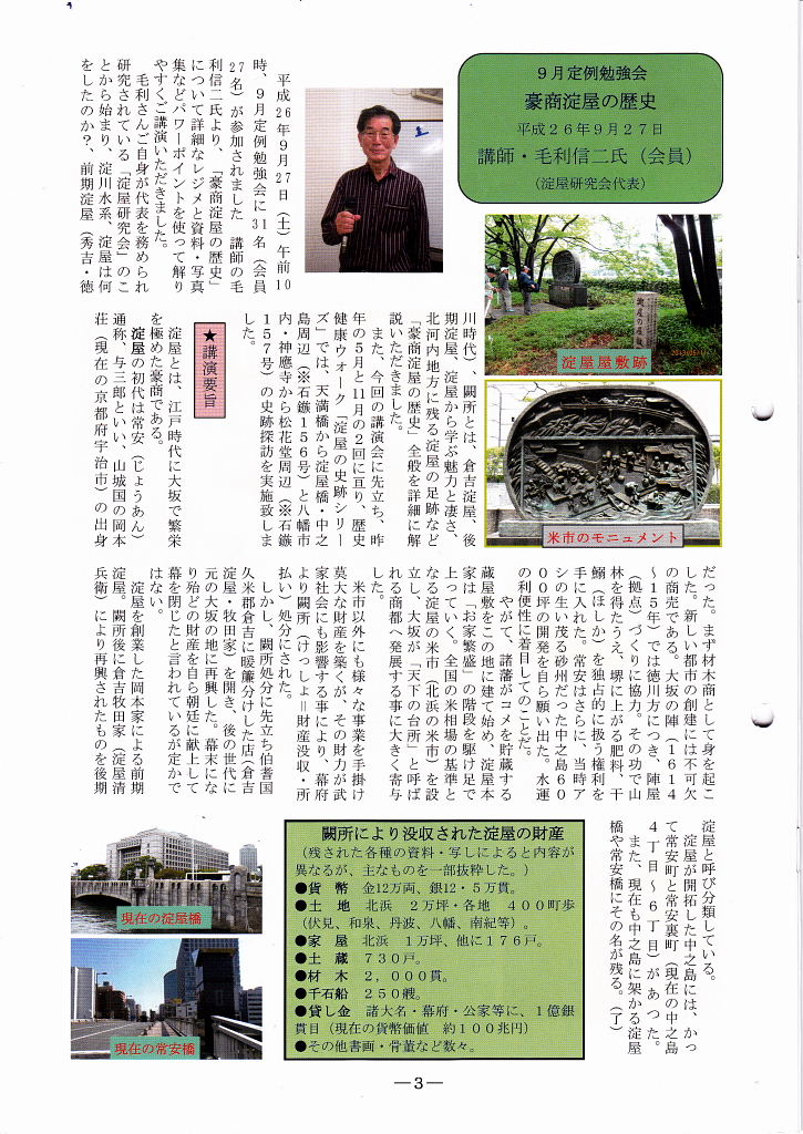 講師の毛利信二氏より「豪商淀屋の歴史」でご講演をいただいた「石鏃」159号3P ![]() |