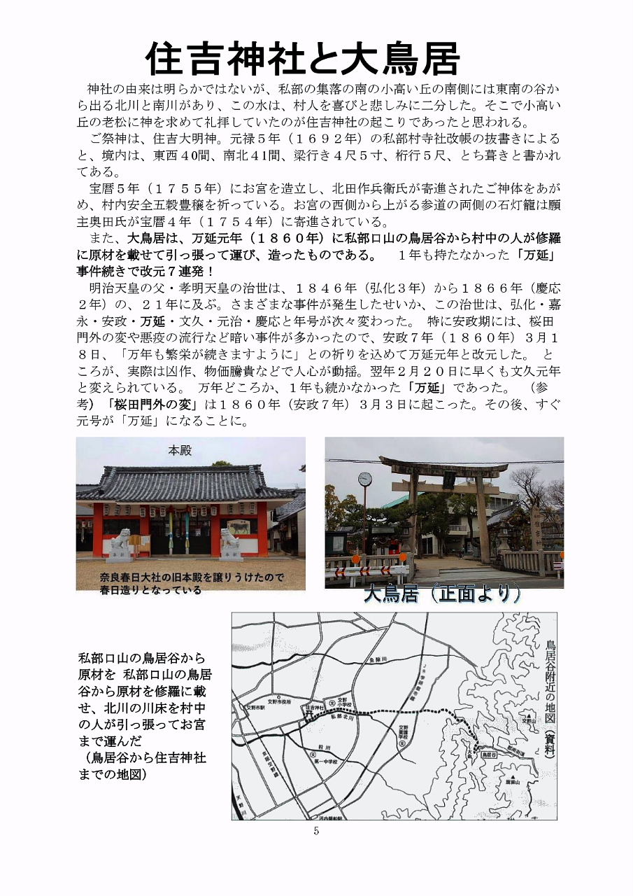 祭神は住吉四神で元禄5年(1692)の私部村寺社改帳によると、いつ勧請したか分からないとあります。社殿は住吉神社であるから住吉作りと思われるが、春日造りとなっている。これは奈良春日大社の社殿が20年毎に建て替えとなるので、江戸時代にその宮殿を譲り受けたからである。 また昔、境内に現光寺という宮寺があって、空禅(きゅうせん)というお坊さんが住んでいたという。会館の裏に空禅藪と呼ばれる所があり歴代の住職の墓がある。 また神社の入り口にある大鳥居は万延元年(1860)に私部口山の鳥居谷から原材を運んできて造ったものであります。 |