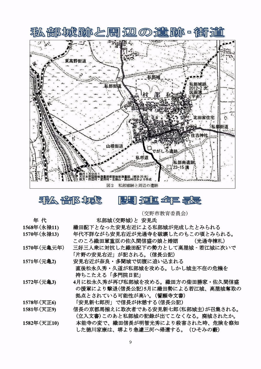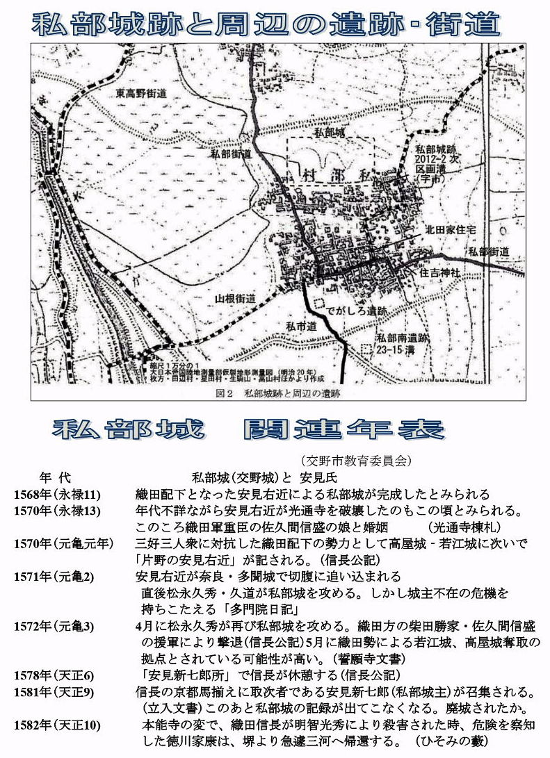 | 【私部城の歴史】 私部城は何時頃出来たか? 1568年{永禄11}織田配下となつた安見右近により完成したとみられる 1571年{元亀2}安見右近が奈良多聞城で切腹においこまれる。直後に私部城を攻める。城主不在の危機を乗り越える 1572年{元亀3}4月松永久秀が再び私部城を攻める。この時は織田方の柴田勝家、佐久間信盛等の援軍により撃退 1578年 (天正6)安見新七郎所で信長が休息する 1581年 (天正9)信長の馬揃えに取次者である安見新七郎が召集される。 |