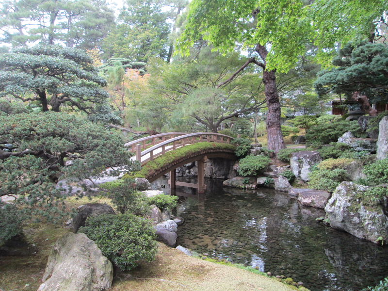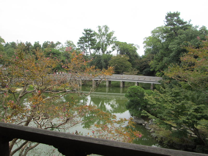 ![]() 2階から撮影した池の写真 中央に架かる立派な反橋は明治15年に竣工した高倉橋と呼ばれている。 |