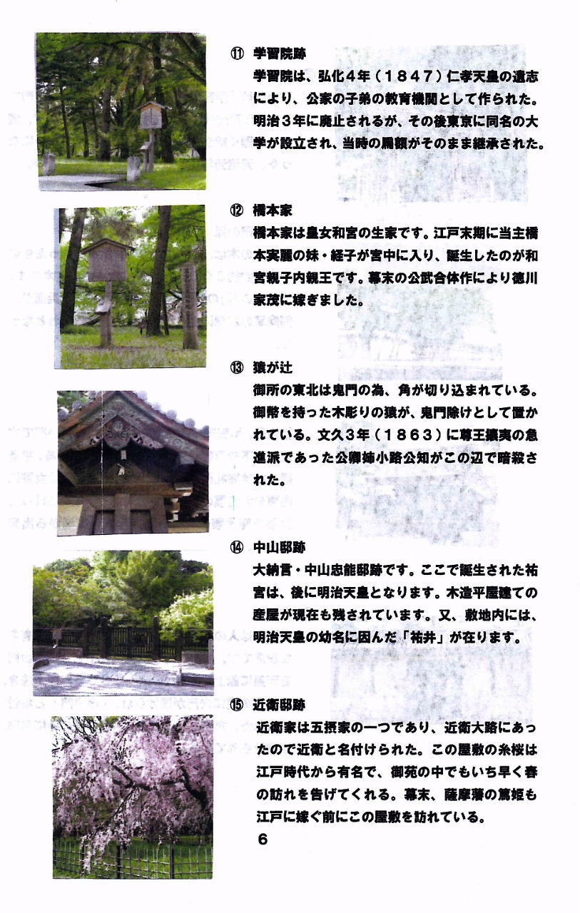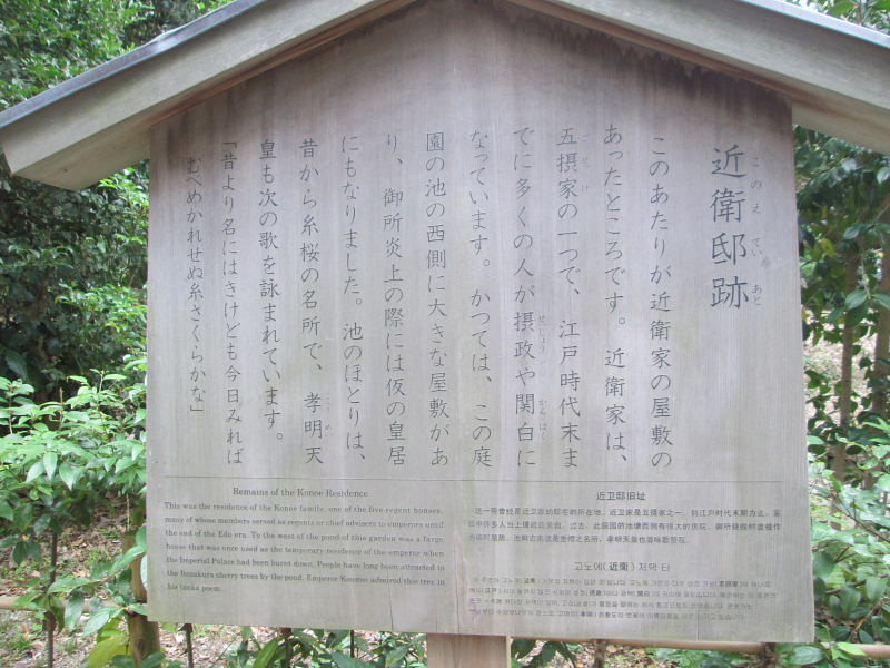 | 近衛家は五摂家の一つであり、近衛大路にあったので近衛と名付けられた。 この屋敷の糸桜は江戸時代から有名で、御苑の中でもいち早く春の訪れを告げてくれる。 幕末、薩摩藩の篤姫も江戸に嫁ぐ前にこの屋敷を訪れている。 |