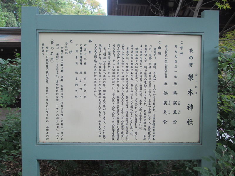 | 明治18年10月、三條實萬公(さんじょうさねつむこう)を御祭神として創建、別格官幣者に列せられ大正4年の大正天皇即位式にあたり、實萬公の御子實美公(さねとみこう)が第二座御祭神として合祀されました。三條家は五摂家に次ぐ公郷最高の名家でした。 |