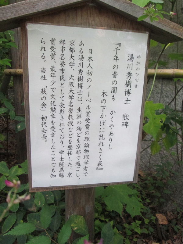 | 日本人初のノーベル賞受賞の理論物理学者である湯川秀樹博士は、生涯の殆どを京都で過ごし、京都大学、大阪大学名誉教授などを歴任されました。京都市名誉市民として表彰されており、学士院恩賜賞受賞、最年少で文化勲章を受章したことでも知られています。当社「萩の会」初代会長。 『千年の昔の園も かくやありし 木の下かげに 乱れさく萩』 |