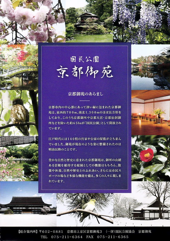 | 京都御所と京都仙洞御所。大宮御所、京都迎賓館を包含する東西700m、南北1300mの広大な緑地で、環境省が管理する国民公園、禁門の変で有名な蛤御門など四方から自由に出入りができ、芝生や梅林などがある格好の散策地。レストハウス、運動広場など憩いの場の他、関院宮邸跡、庭園、御苑の歴史と自然が学べる展示館、拾翠邸など歴史的遺構も残る。 |