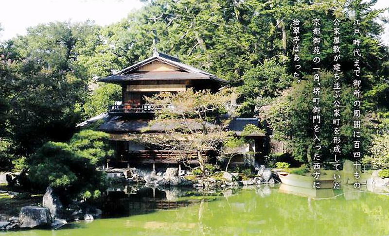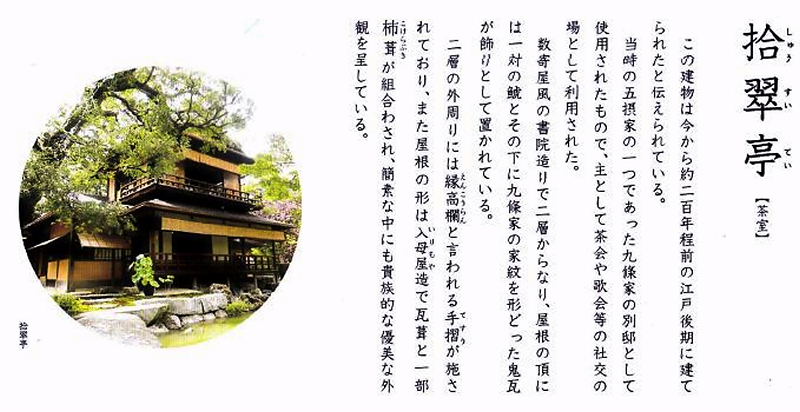 | 九條邸跡(拾翠邸) 茶室 茶室として残つている建物は、拾翠亭と呼ばれ、九条家屋敷の貴重な遺構の一つです。 九條池を中心とした美しい庭園は、四季折々の風情を醸し出している。 池の中にある厳島神社は、邸内社として祀られている。 |