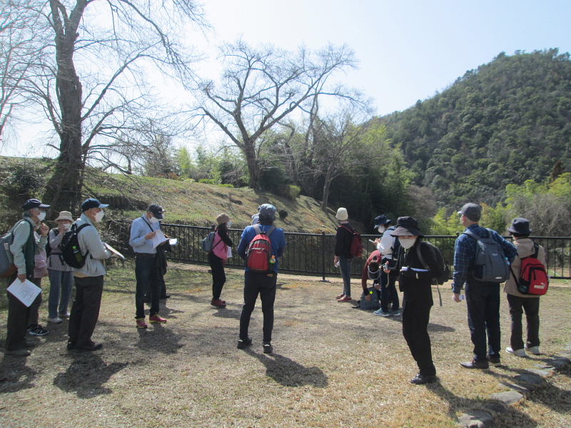 ![]() 「御土居」を説明される案内人の盛岡博さん(中央) |