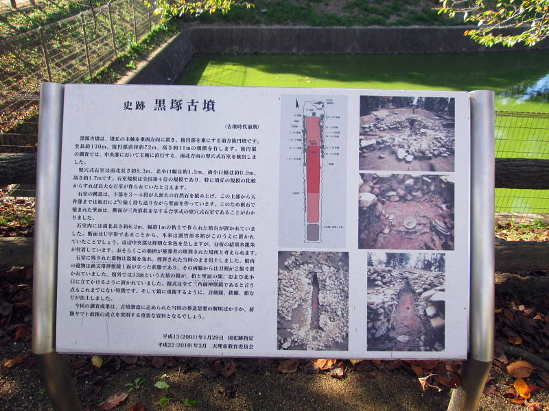 | 古墳時代前期(三世紀後半)の古墳と推定され、古墳の規模は現状で全長約134mの前方後円墳です。現在は柳本公園の一画にあり周辺は池に囲まれていますが、古墳が造られた当初の姿をほぼ良好にとどめている。後円部では長大な竪穴式石室の存在が明らかになり、埋蔵品も三角縁神獣鏡を中心として多数出土している。 隣接の古墳展示館で確認することが出来ます。 |
