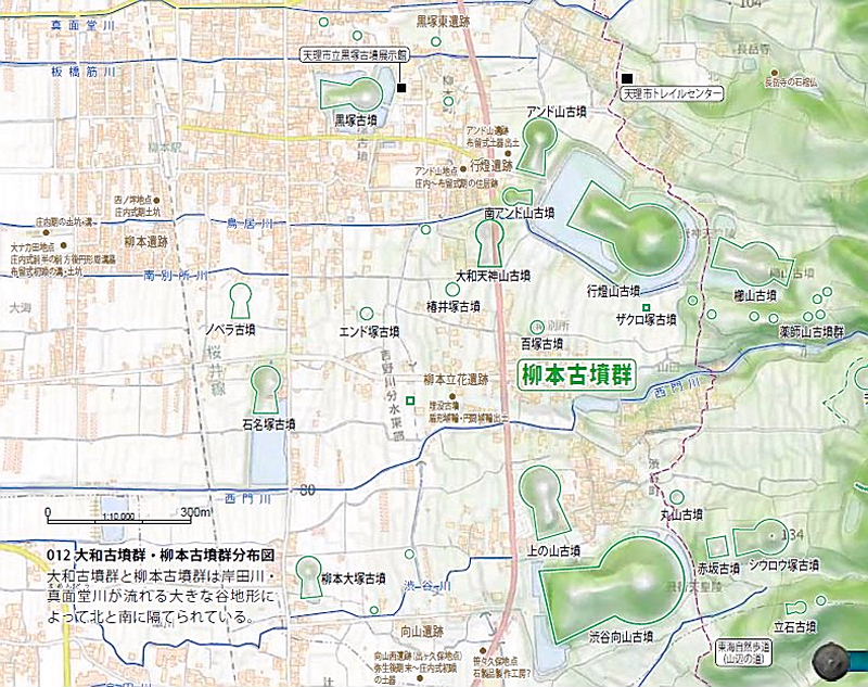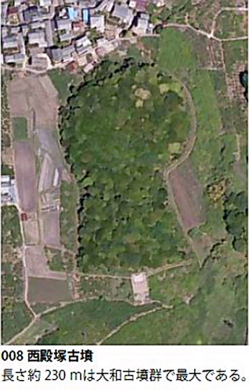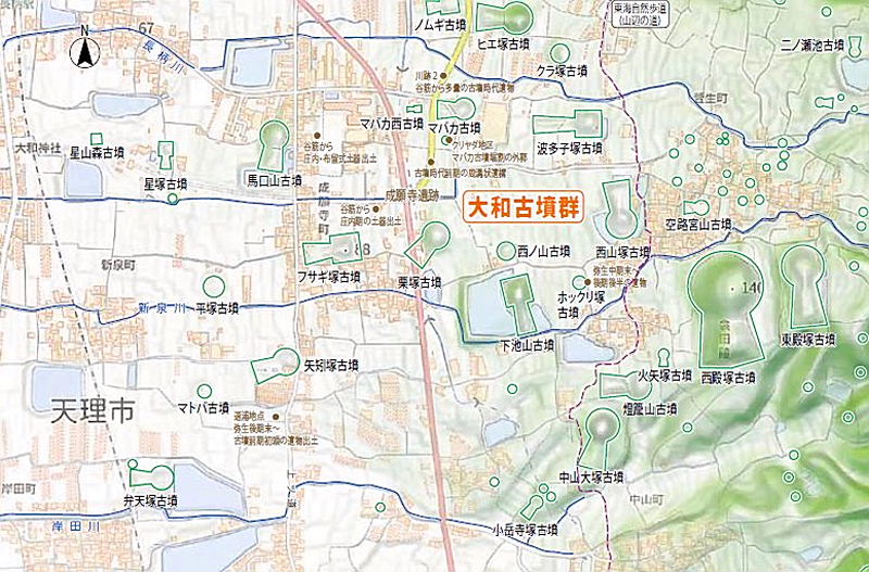 | 大和古墳群は天理市南部の佐保庄町・兵庫町・萱生町・成岸寺町・中山町・岸田町一帯に分布する古墳群で、西殿塚古墳を盟主とする。西方に鎮座する「大和神社」の宮郷である「大和郷」に重複して分布することからこの呼称がある。 | |||||||||||||