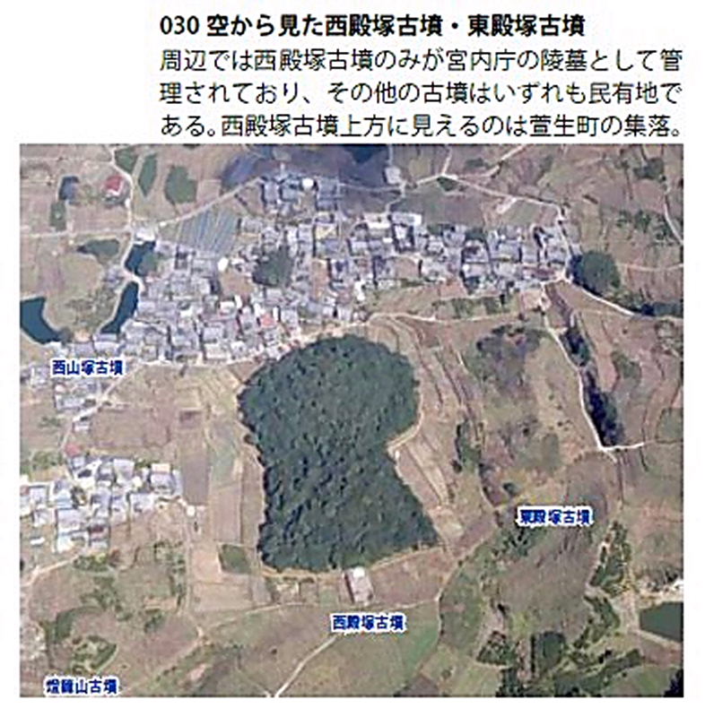 | 宮内庁が「衾田陵(ふすまだのみささぎ)に比定している古墳です。古墳の規模は全長230m、後円部径145m、高さ約16m、前方部幅130m、萱生地域では最大の前方後円墳です。 宮内庁は継体天皇の皇后・手白香皇女(たしらかのひめみこ)の陵墓としていますが古墳の形式は古く、箸塚の次に造られた大型古墳と考えられている。築造時期は古墳時代前期前半で、3世紀後半と見られている。 |